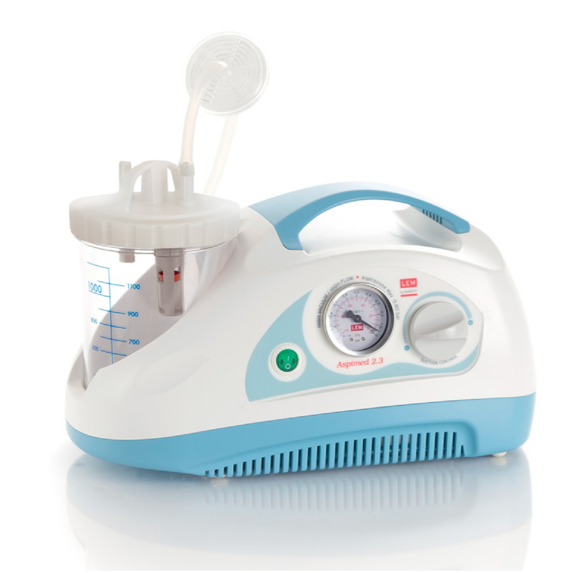 Aspiratore per piccola chirurgia, facilmente trasportabile, leggero e potente grazie al gruppo aspirazione a pistone. E’ idoneo ad un utilizzo continuo. Particolarmente studiato per l’utilizzo domiciliare od in corsia ospedaliera, per l’uso in piccola chirurgia e per tracheotomia. Particolarmente adatto all’aspirazione di liquidi corporei come muco e catarro. Corpo in ABS autoestinguente con elevato isolamento termico ed elettrico in conformità alle vigenti normative di sicurezza europee. L’aspirazione può essere regolata con una manopola posta sul fronte dell’aspiratore e può essere controllata a mezzo del vacuometro di facile lettura. Il vaso in policarbonato da 1 litro è dotato di valvola di troppo pieno ed è sterilizzabile in autoclave.