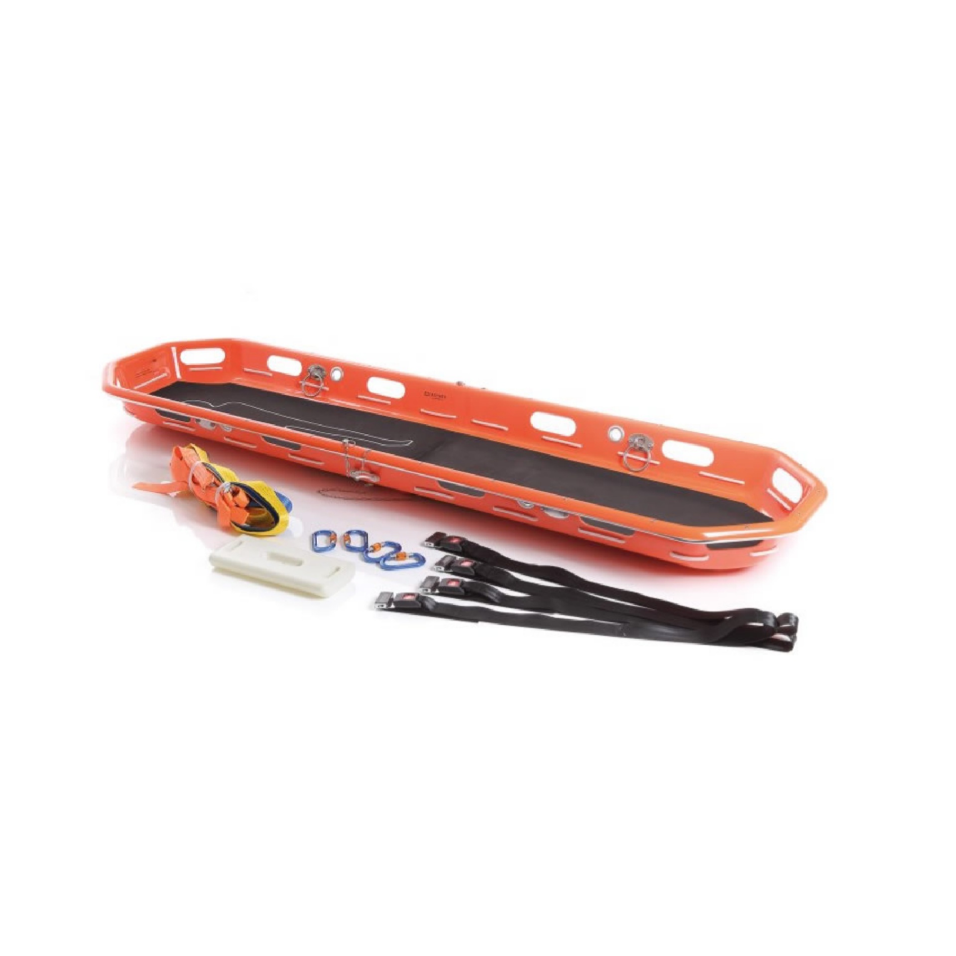 La barella è divisibile in due parti, il che la rende compatta e facile da trasportare. Dotata di cinture di sicurezza, materassino non assorbente e poggiapiedi. Grazie all’imbracatura in dotazione la barella è ideale per il sollevamento e il trasporto con elicottero.