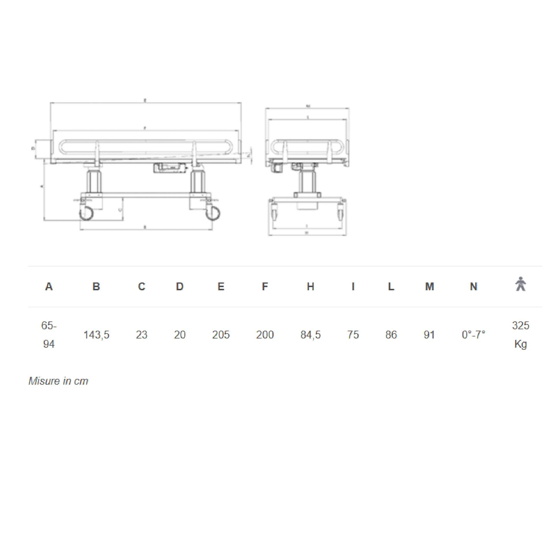 Barella doccia per il lavaggio ed il trasferimento di pazienti, elevabile elettricamente da 65 a 94 cm, con piano di lavaggio inclinabile tramite molla a gas fino a 7° per un corretto drenaggio durante e dopo l’uso.