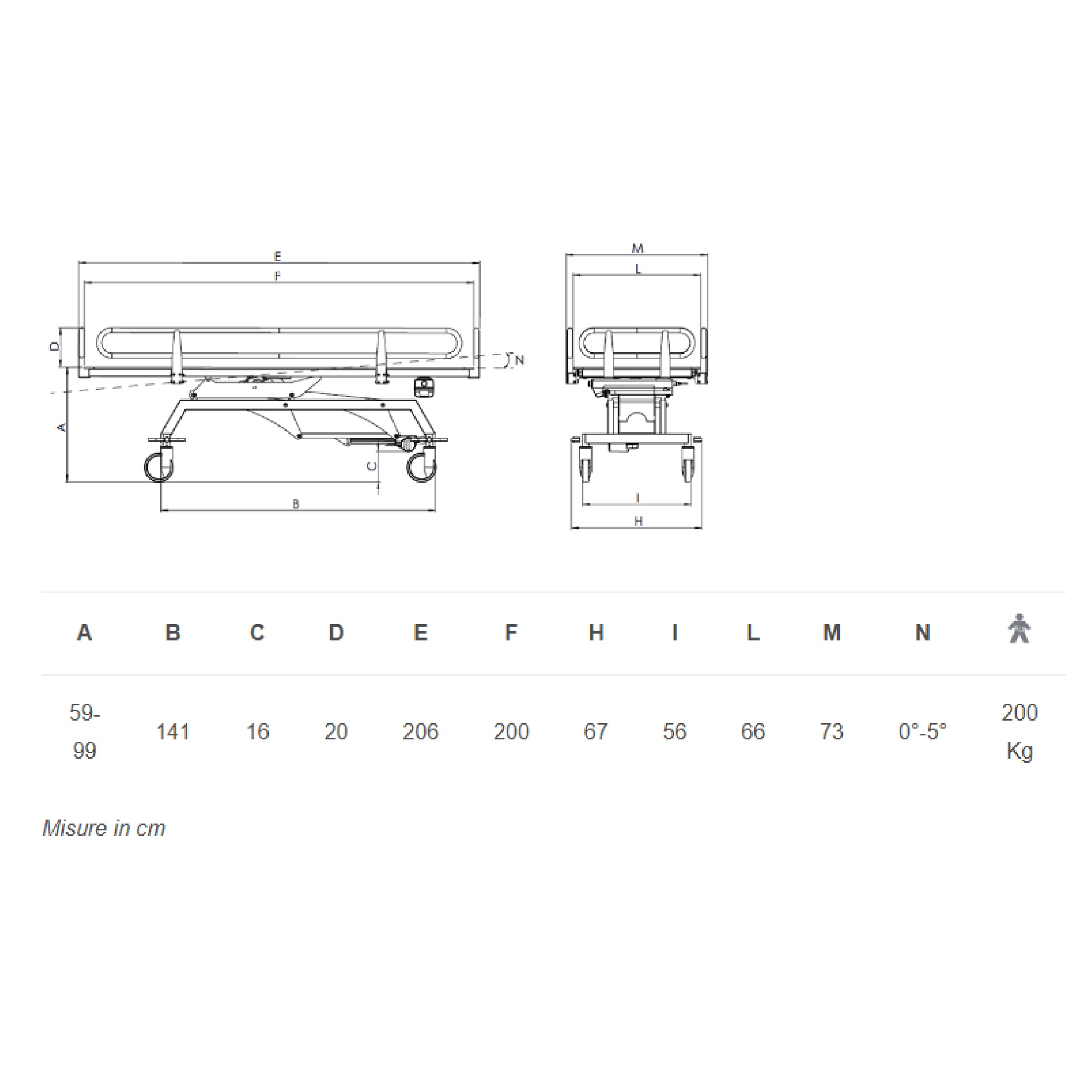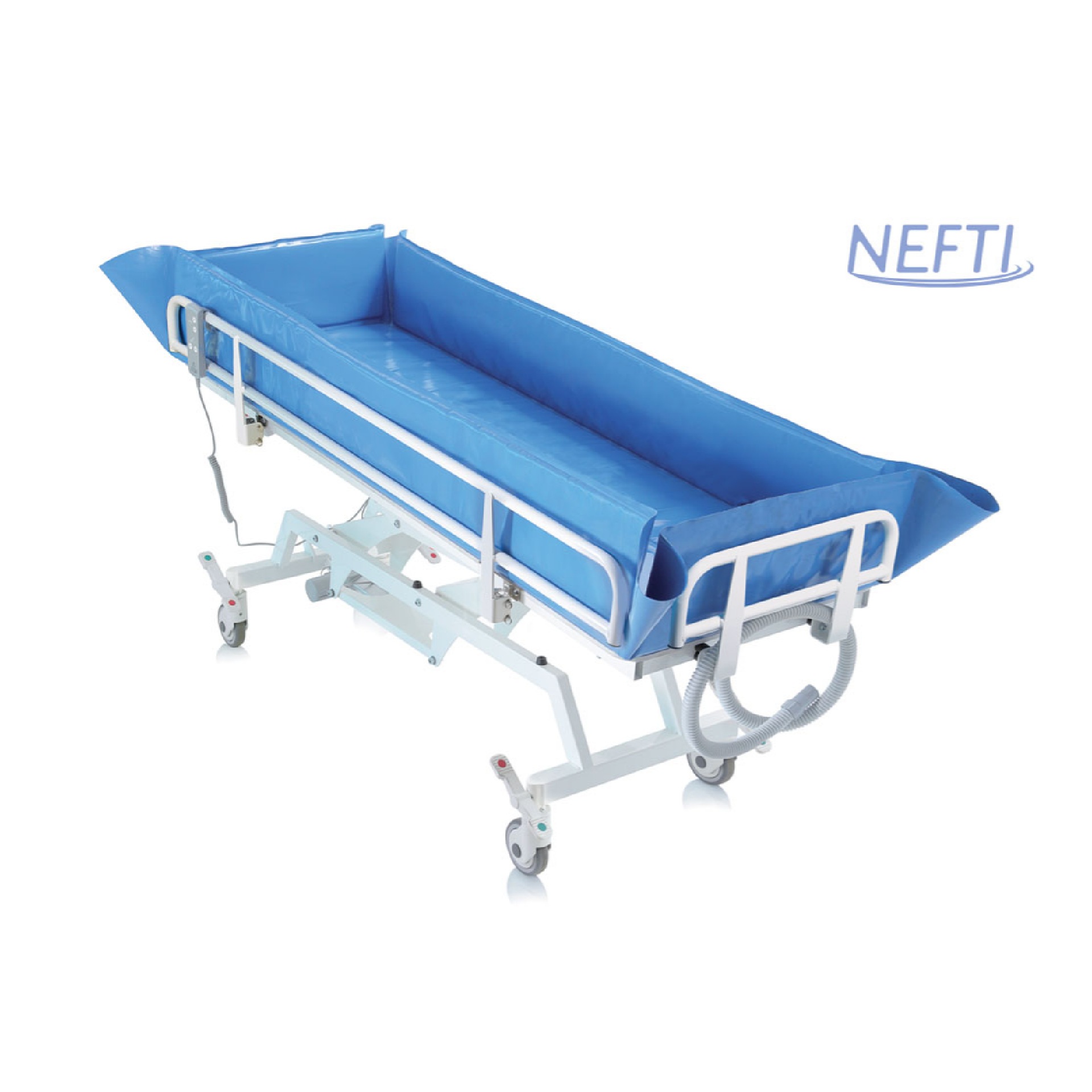 Barella doccia per il lavaggio ed il trasferimento di pazienti, elevabile elettricamente da 59 a 99 cm, con piano di lavaggio inclinabile elettricamente fino a 5° per un corretto drenaggio durante e dopo l’uso.
