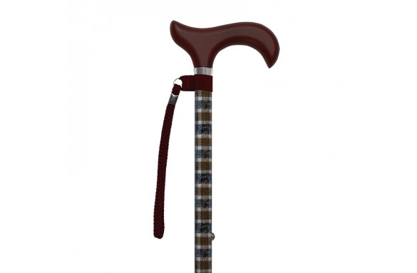 Bastone in alluminio regolabile in altezza, colore fantasie geometriche con manico in legno Marrone, disponibile nella versione tubo intero o pieghevole. Puntale in gomma Marrone.
