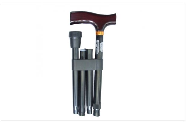 Bastone in alluminio, struttura pieghevole con impugnatura a T in legno.