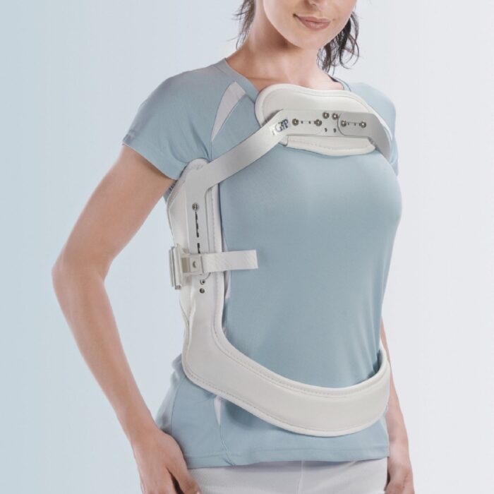 Busto iperestensore a 3 punti con banda pelvica fissa. Spinta sternale fissa rivestita di similpelle imbottita.