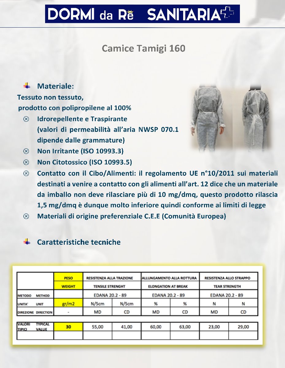 Camice monouso in TNT , tessuto non tessuto con polipropilene al 100%.