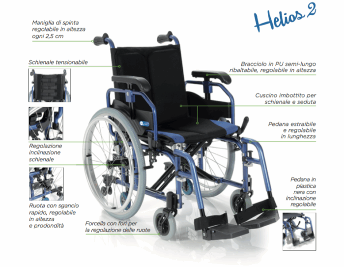 Ruotine di sicurezza e ruotine antiribaltamento di serie. Ruote anteriori in PU Ø 15 cm con forcella in alluminio con fori per la regolazione delle ruote.
