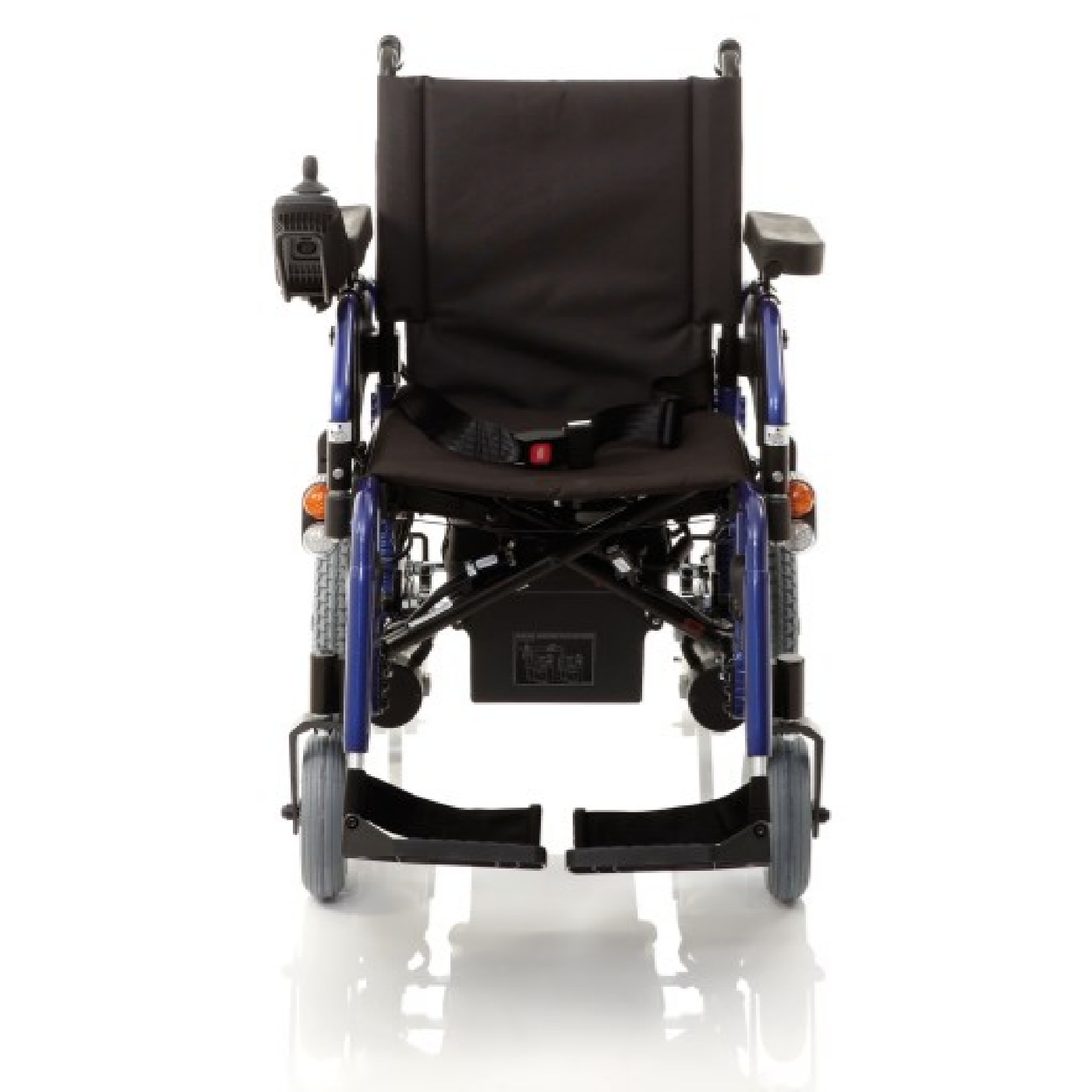 Schienale e seduta in nylon nero imbottito, completa di cintura di sicurezza. Braccioli regolabili in altezza, ribaltabili ed estraibili.