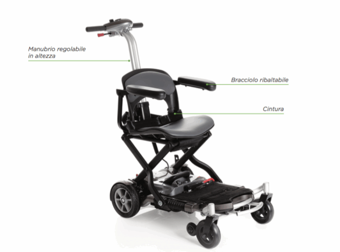La struttura pieghevole in alluminio rende la carrozzina l’ausilio ottimale per spostamenti in piena libertà. La struttura permette di aprire e chiudere l’ausilio con l’utilizzo di una sola mano in meno di 6 secondi.
