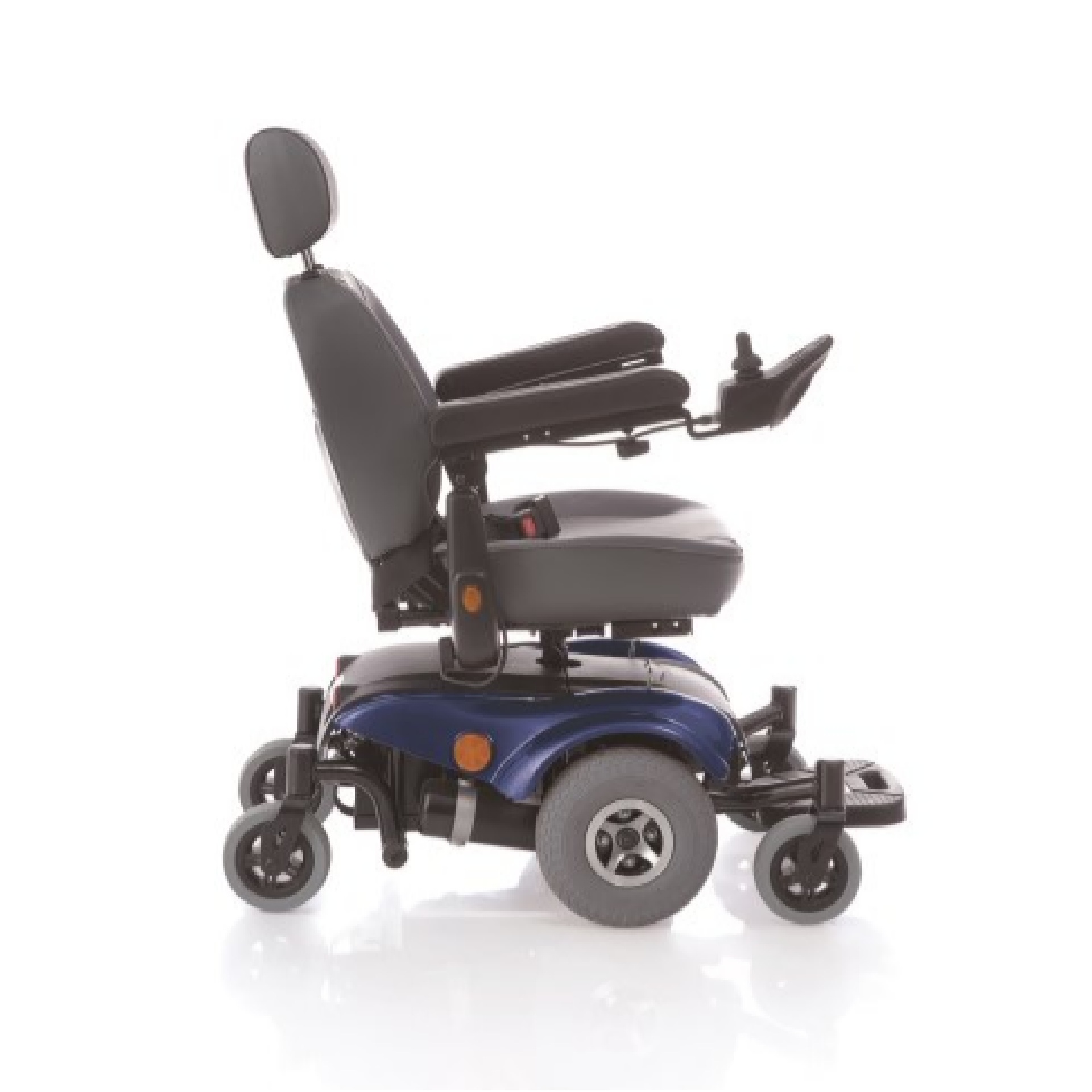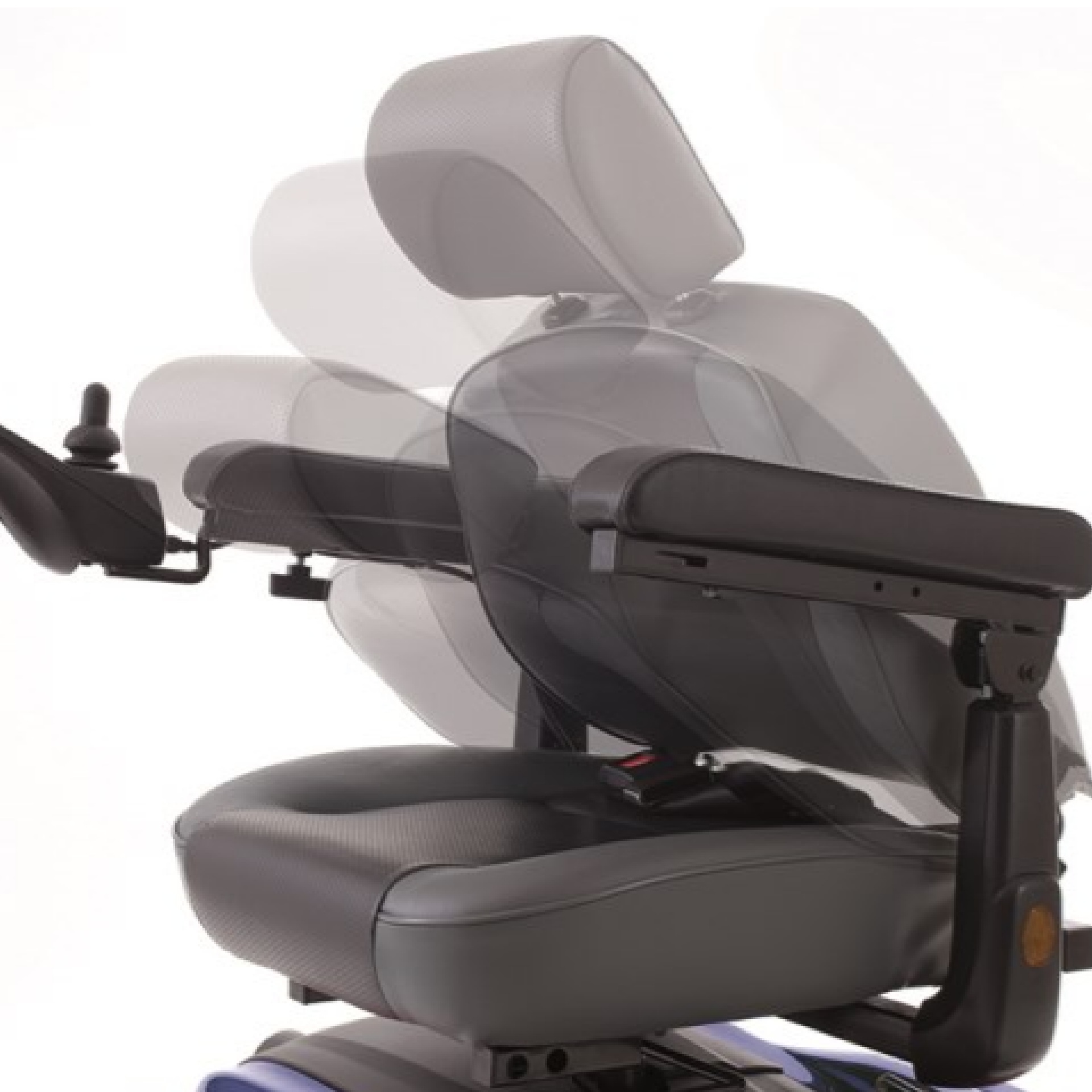 grazie al posizionamento centrale dell’asse con le ruote motrici. Seduta girevole su entrambi i lati. Schienale inclinabile posteriormente e reclinabile anteriormente con poggiatesta regolabile in altezza. Braccioli ribaltabili e regolabili in larghezza da 60 a 70 cm. Pedana regolabile in altezza e richiudibile. Portata max 136 Kg.