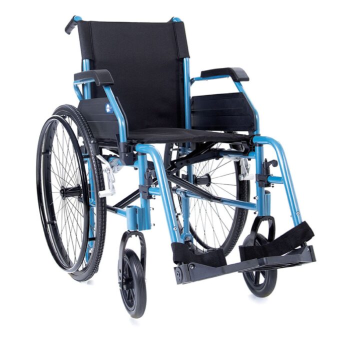 Telaio in alluminio leggero pieghevole; singola crociera; bracciolo ribaltabile ed estraibile; ruote posteriori antiforatura da 24”, sgancio rapido; perno della ruota posteriore regolabile in più posizioni e forcella anteriore regolabile in inclinazione; ruote anteriori in PU da 8″ regolabile in più posizioni; ruotini di sicurezza ideali per passaggi stretti; poggiapiedi regolabile in inclinazione.