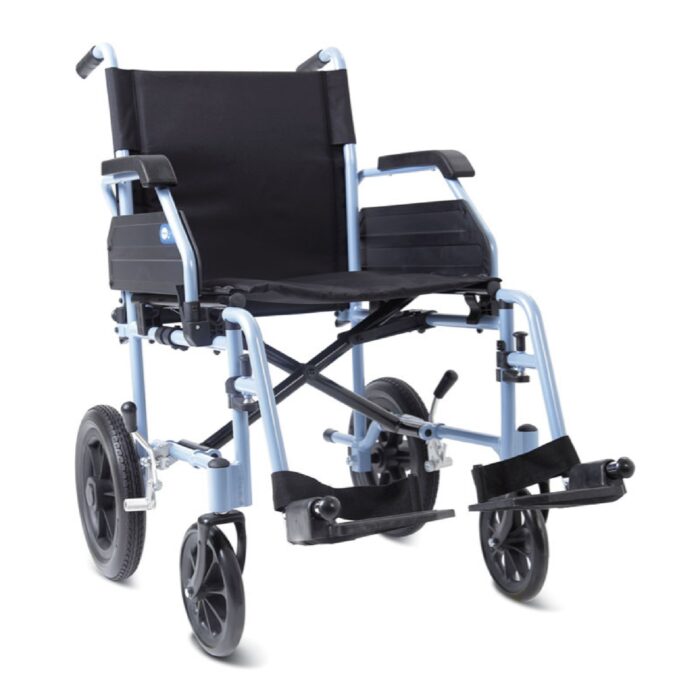 Telaio in alluminio leggero pieghevole; singola crociera; bracciolo ribaltabile ed estraibile; ruote posteriori antiforatura da 12”; ruote anteriori in PVC da 8″.