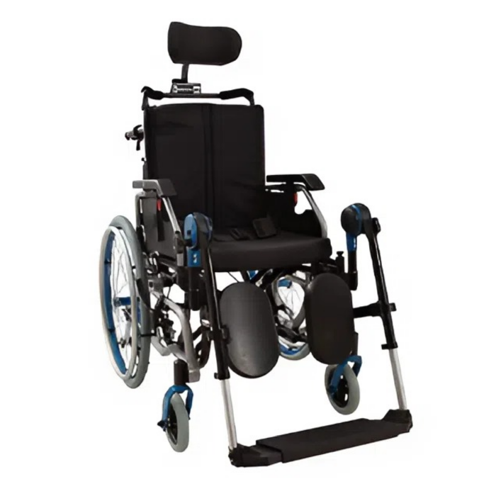 Carrozzina in alluminio di alta qualità, basculante e pieghevole con telaio a doppia crociera.
