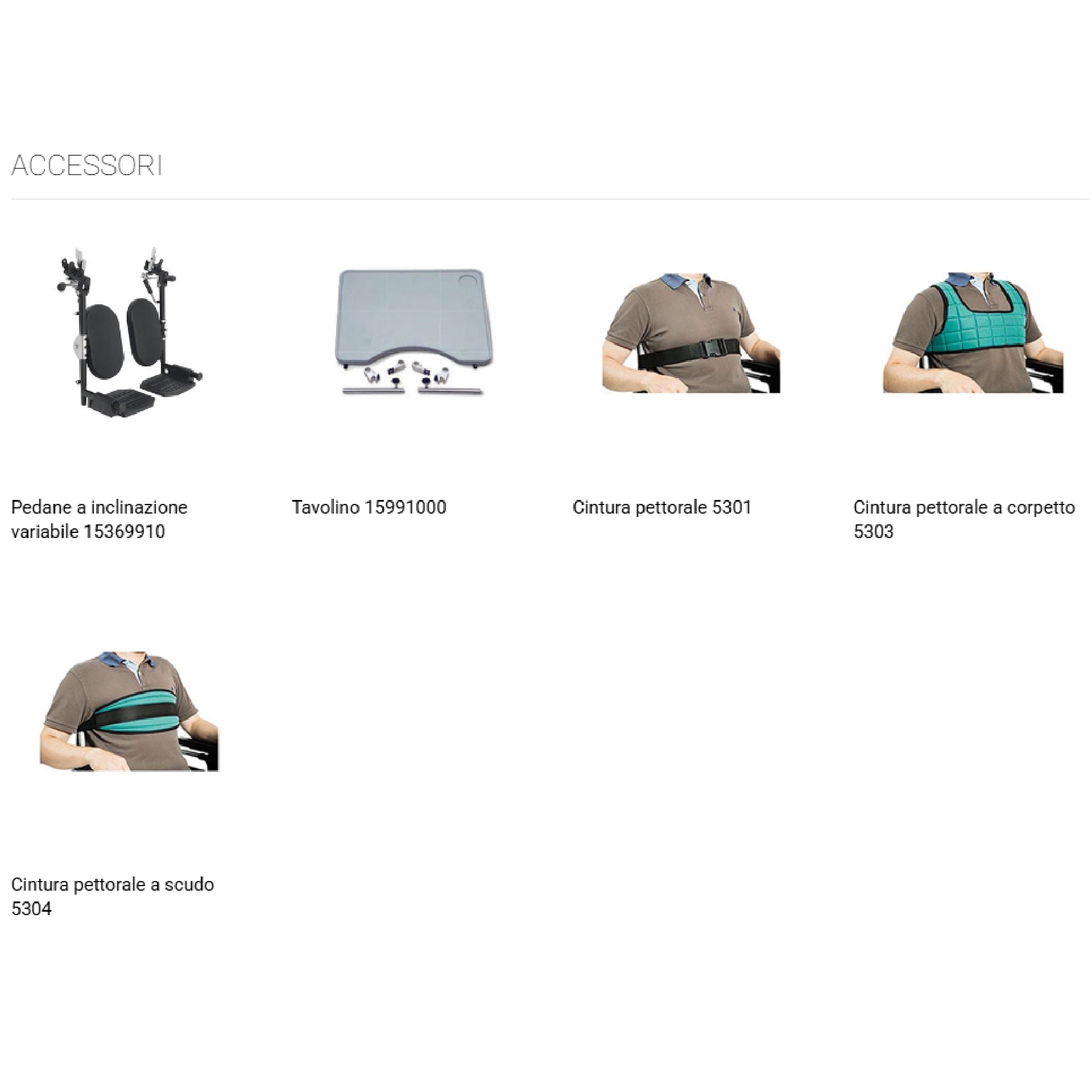 • Appoggiagambe ribaltabili, estraibili e intraruotabili, pedane regolabili in altezza e dotate di cinturino ferma tallone