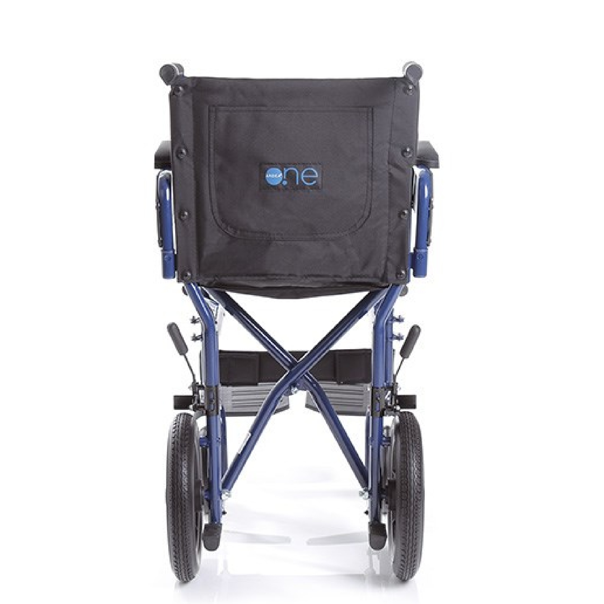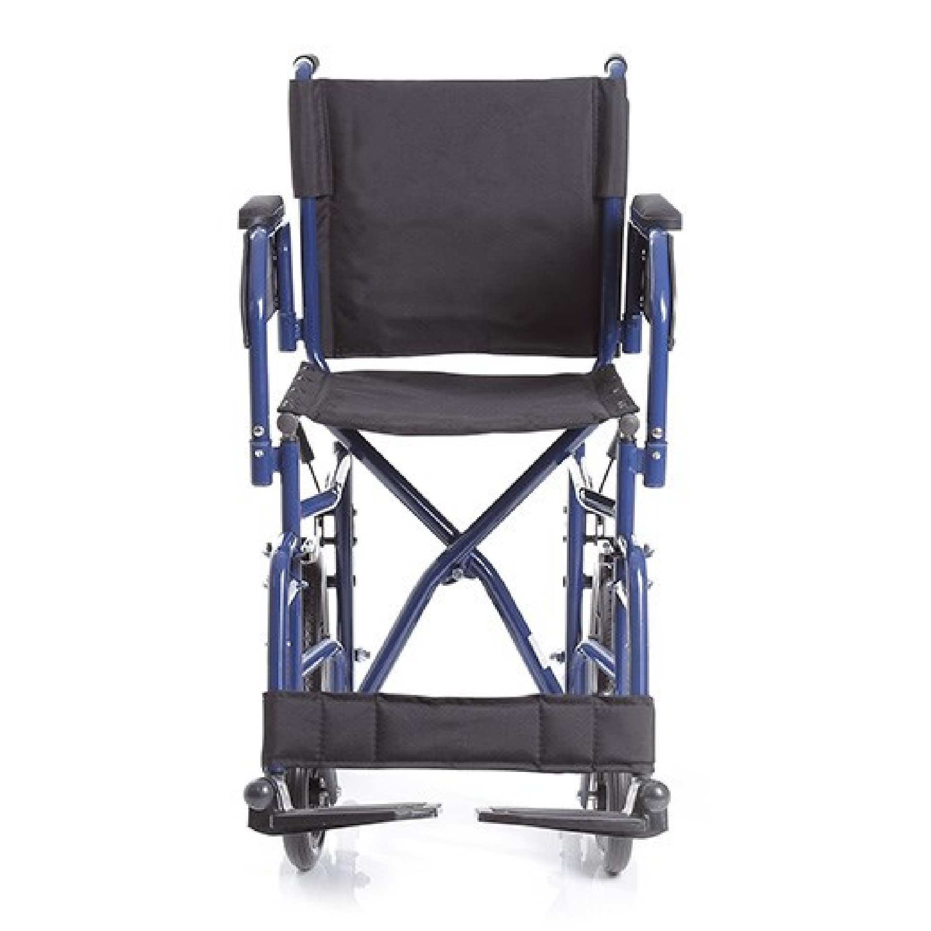 Telaio stabilizzante realizzata in acciaio verniciato crociera SINGOLA, seduta e schienale in nylon nero imbottito e lavabile, tasca porta documenti sul retro. Ruote posteriori piene in PU (Ø 30 cm), posizionate sotto la seduta per ridurre gli ingombri laterali e semplificare l’attraversamento dei passaggi stretti, doppio foro per essere trasformata in modello ad autospinta (kit optional). Ruote anteriori in PU (Ø 18 cm) con forcella in plastica. Pedane estraibili, regolabili in lunghezza con pedana in plastica nera e cinturino ferma-polpaccio.