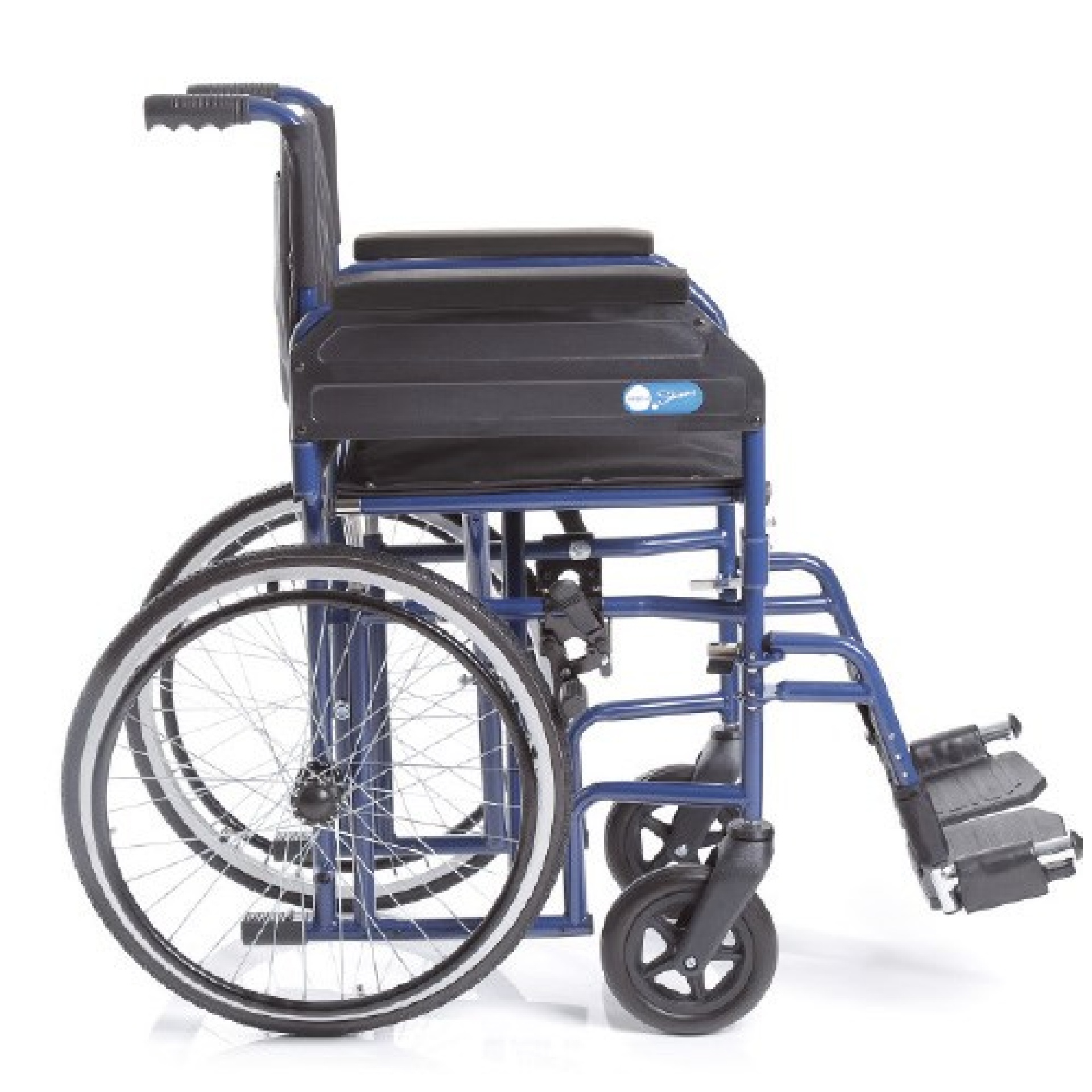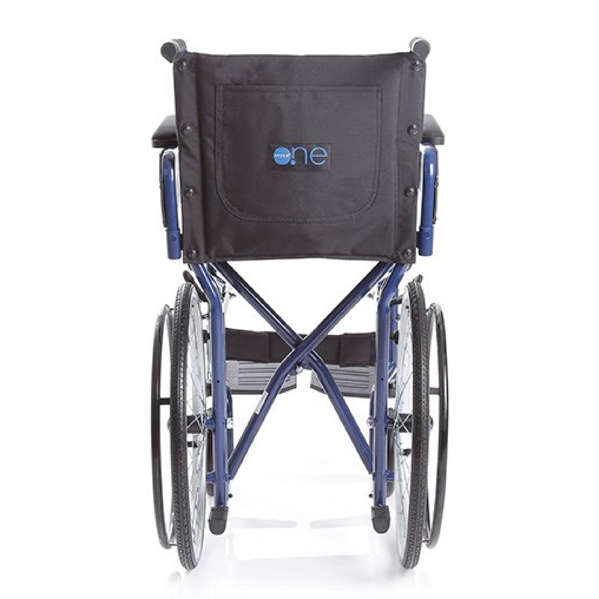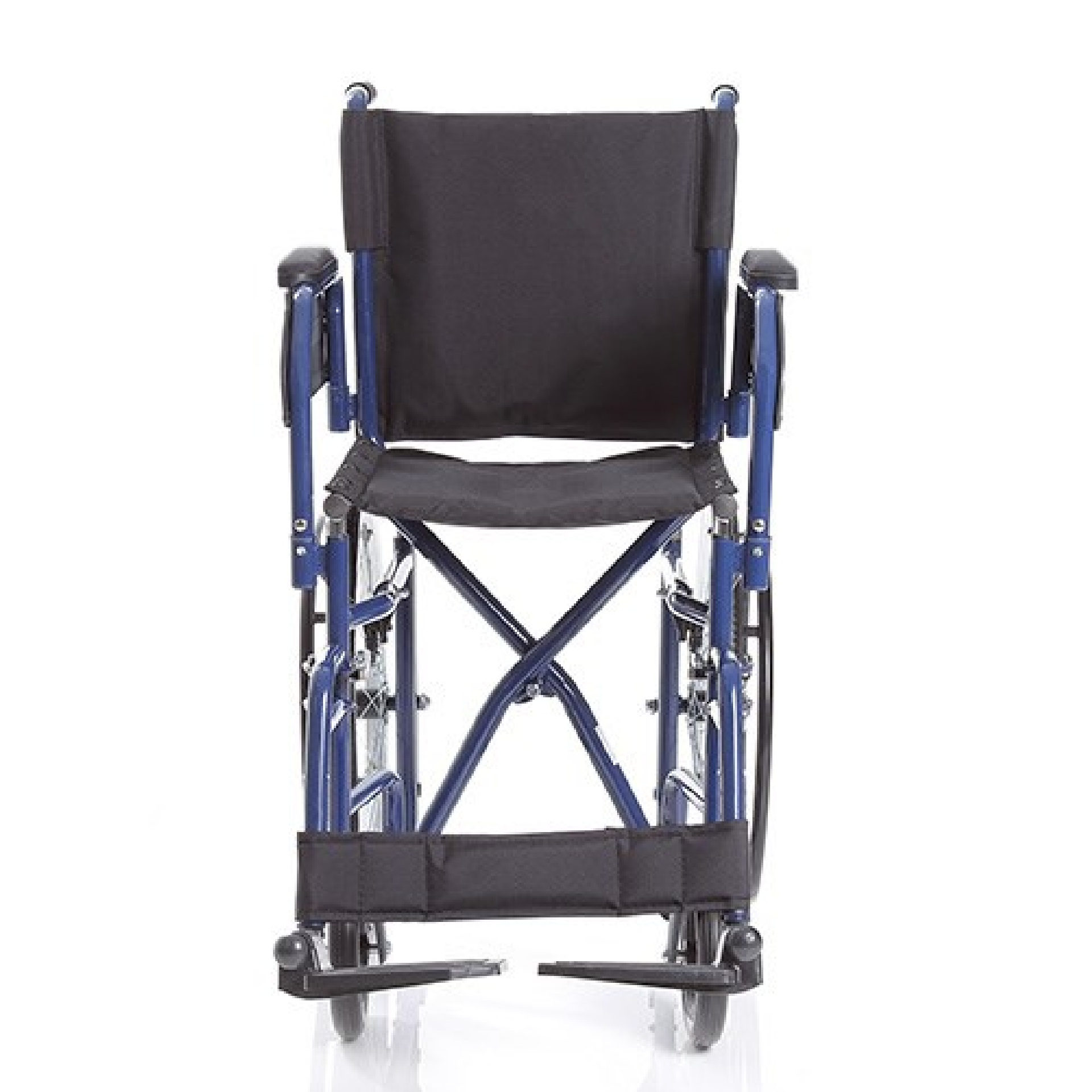Telaio stabilizzante, realizzata in acciaio verniciato crociera SINGOLA, seduta e schienale in nylon nero imbottito e lavabile, tasca porta documenti sul retro. Ruote posteriori in PU senza camera d’aria (Ø 50 cm) a razzi con corrimano in alluminio verniciato, posizionate sotto la seduta per ridurre gli ingombri laterali e semplificare l’attraversamento dei passaggi stretti, doppio foro per essere trasformata in modello da transito (kit optional). Ruote anteriori in PU (Ø 18 cm) con forcella in plastica. Pedane estraibili, regolabili in lunghezza con pedana in plastica nera e cinturino ferma-polpaccio.