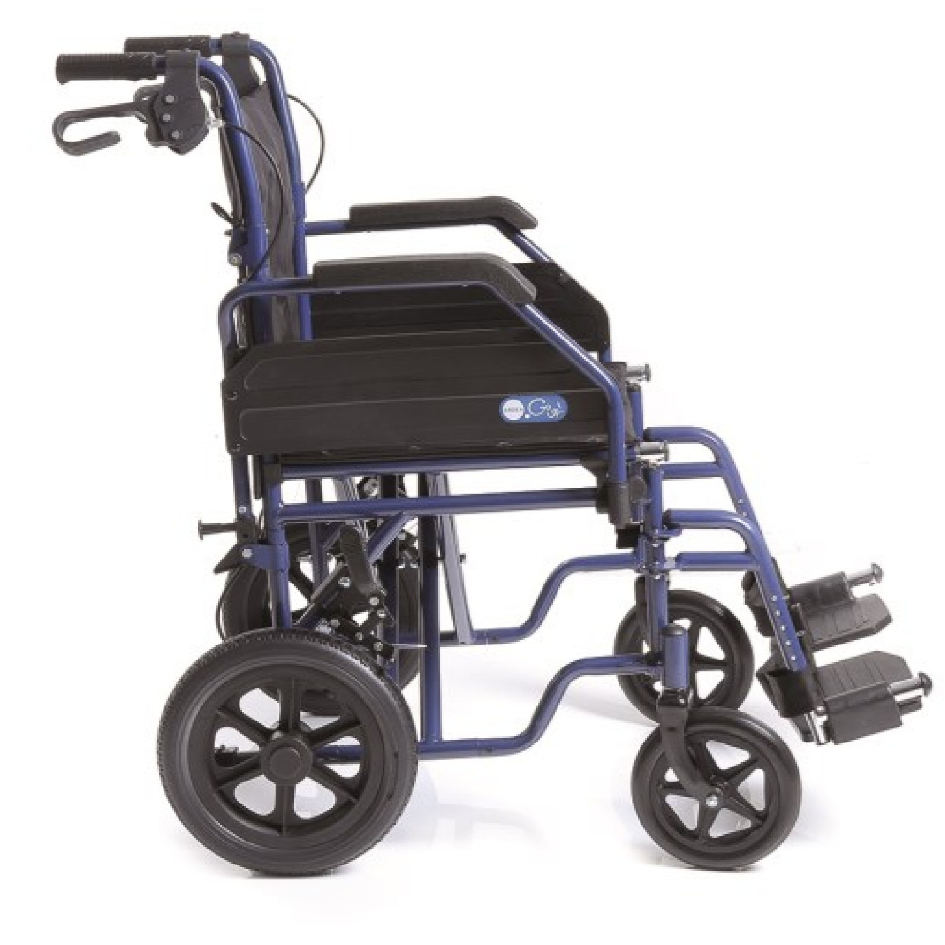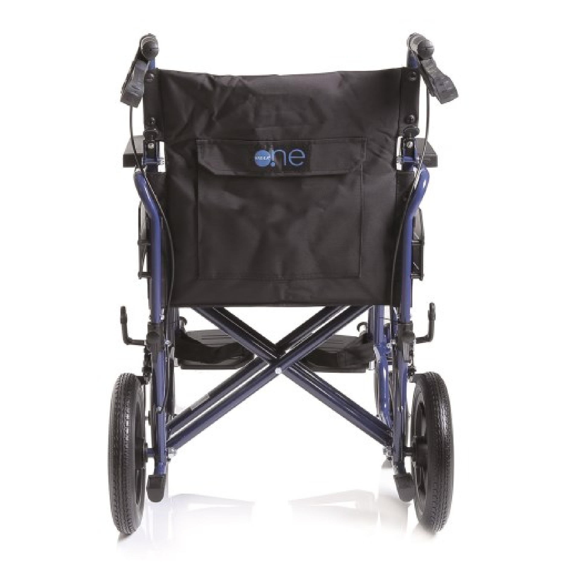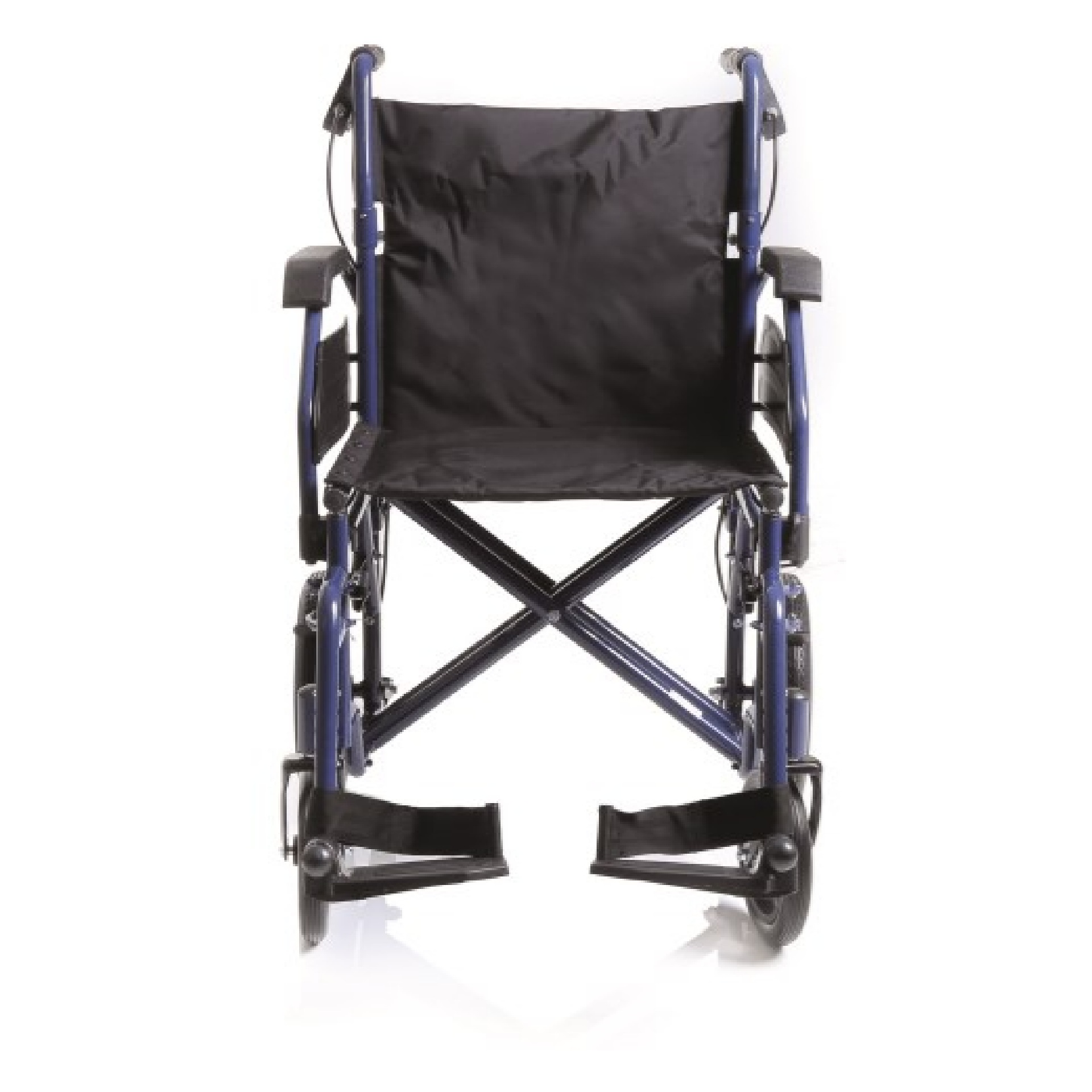 Telaio stabilizzante in acciaio verniciato DOPPIA crociera, seduta e schienale in nylon nero imbottito e lavabile, tasca portadocumenti sul retro. Ruote posteriori (Ø 30 cm), gomme nere in PU. Ruote anteriori nere in PU (Ø 20 cm – spessore 3 cm) con forcella in acciaio. Braccioli corti ribaltabili ed estraibili con imbottitura in PU. Schienale pieghevole, freni operatore. Pedane estraibili regolabili in lunghezza con pedana in plastica nera e cinturino ferma-tallone.