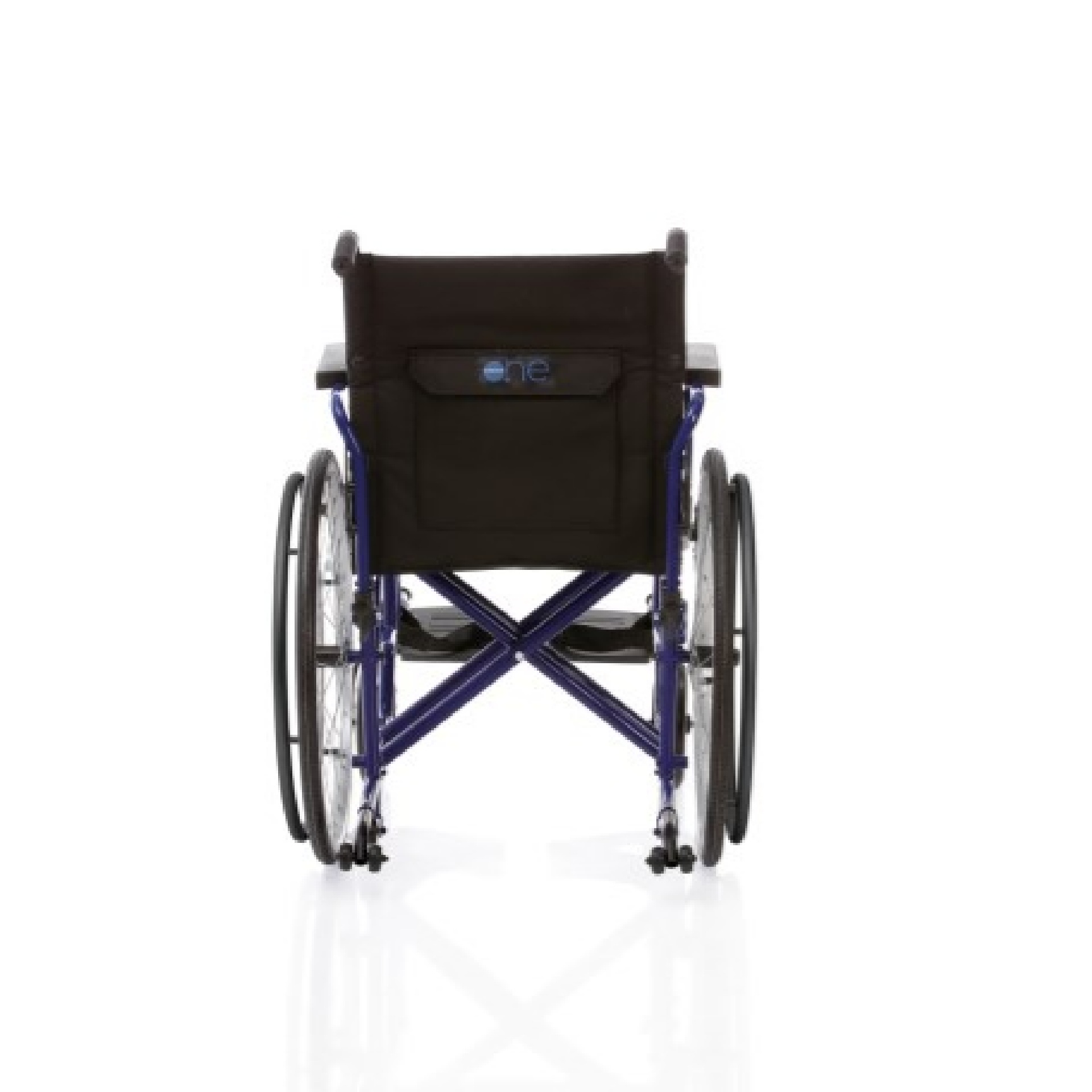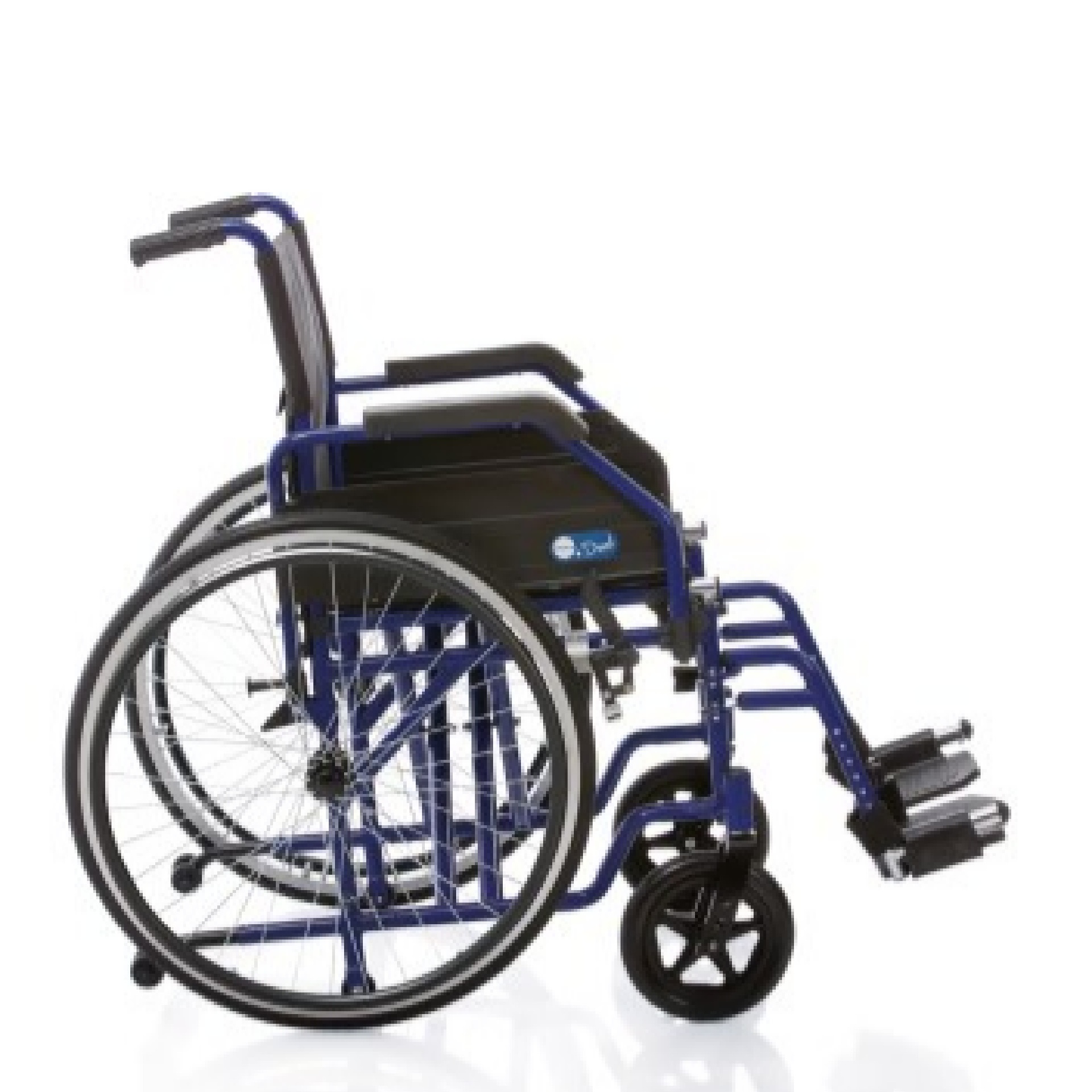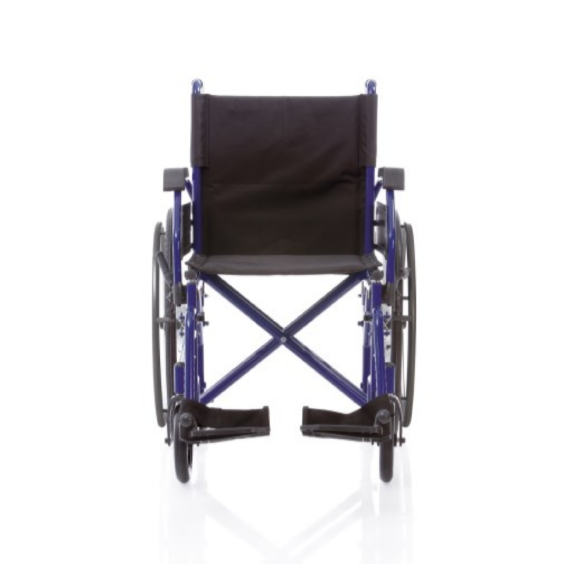 Telaio stabilizzante in acciaio verniciato DOPPIA crociera, seduta e schienale in nylon nero imbottito e lavabile, tasca porta documenti sul retro. Ruote posteriori (Ø 60 cm) in alluminio a razzi con sgancio rapido, gomme nere in PU senza camera d’aria, ruotini di sicurezza e ruotini antiribaltamento di serie, doppio foro sulla struttura per trasformazione in carrozzina da transito (Kit Optional). Ruote anteriori nere in PU (Ø 20 cm – spessore 3 cm) regolabili in più posizioni, con forcella in alluminio. Braccioli semi-lunghi in PU, elevabili in altezza, ribaltabili ed estraibili. Pedane estraibili regolabili in lunghezza con poggia piedi in plastica nera e cinturino ferma-tallone.