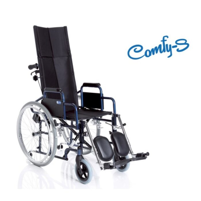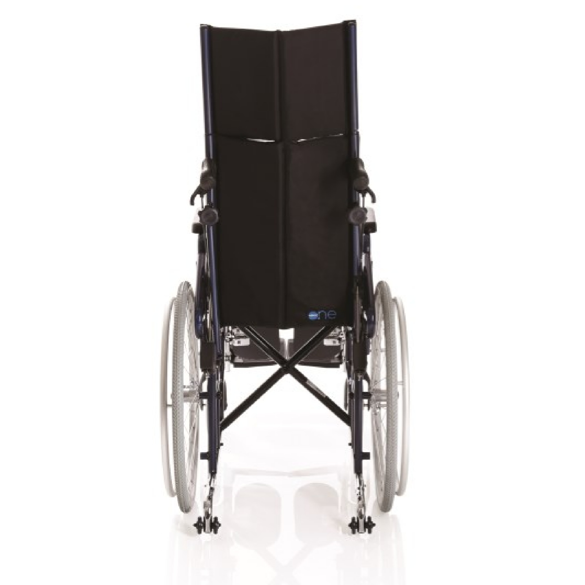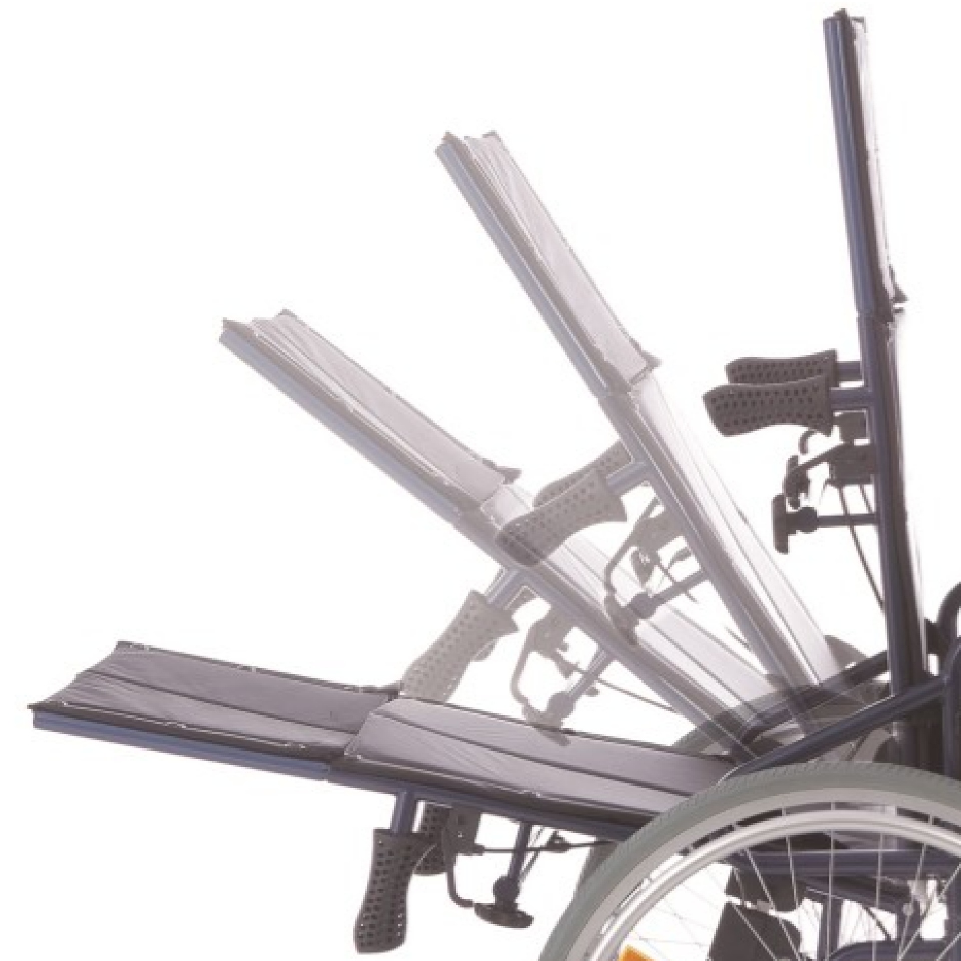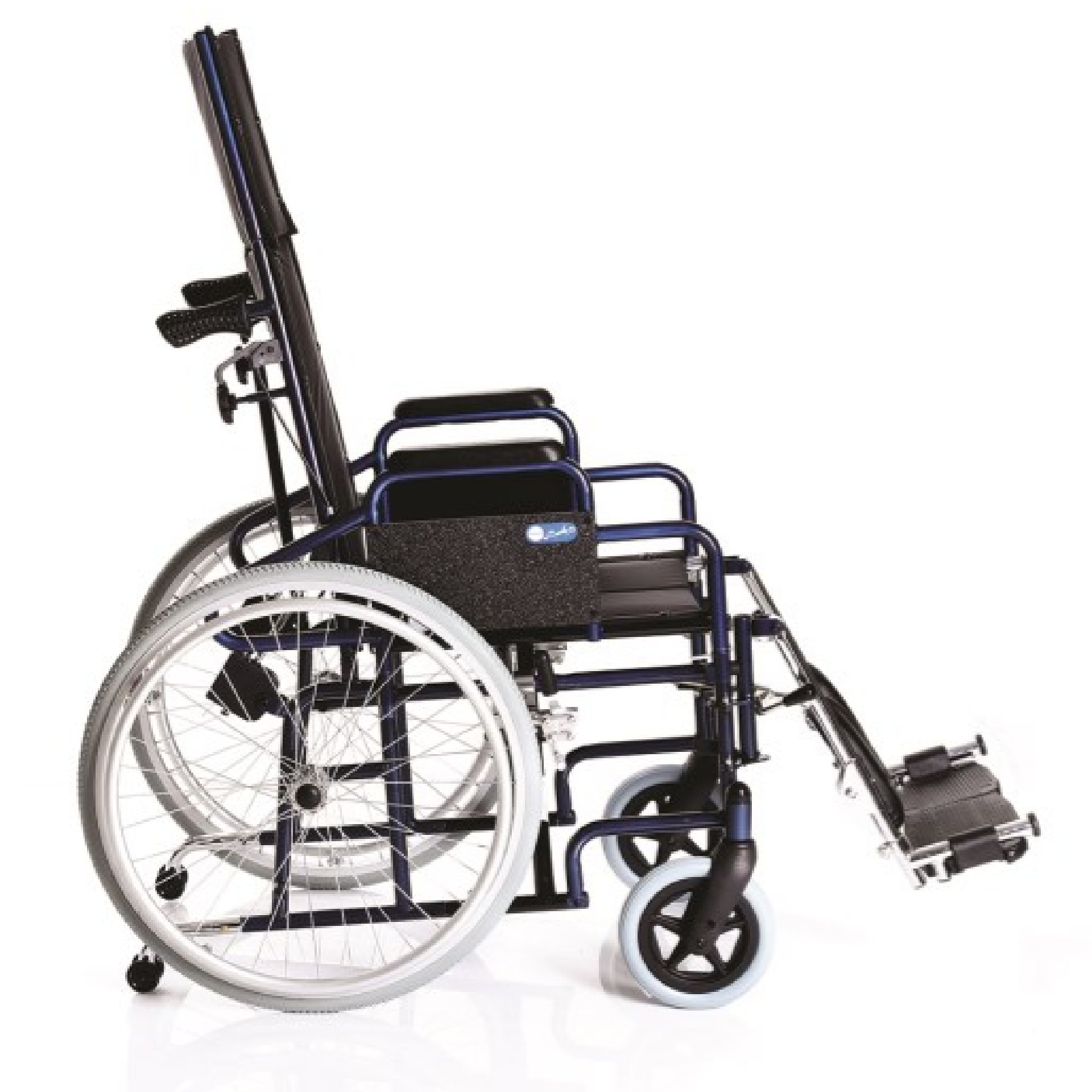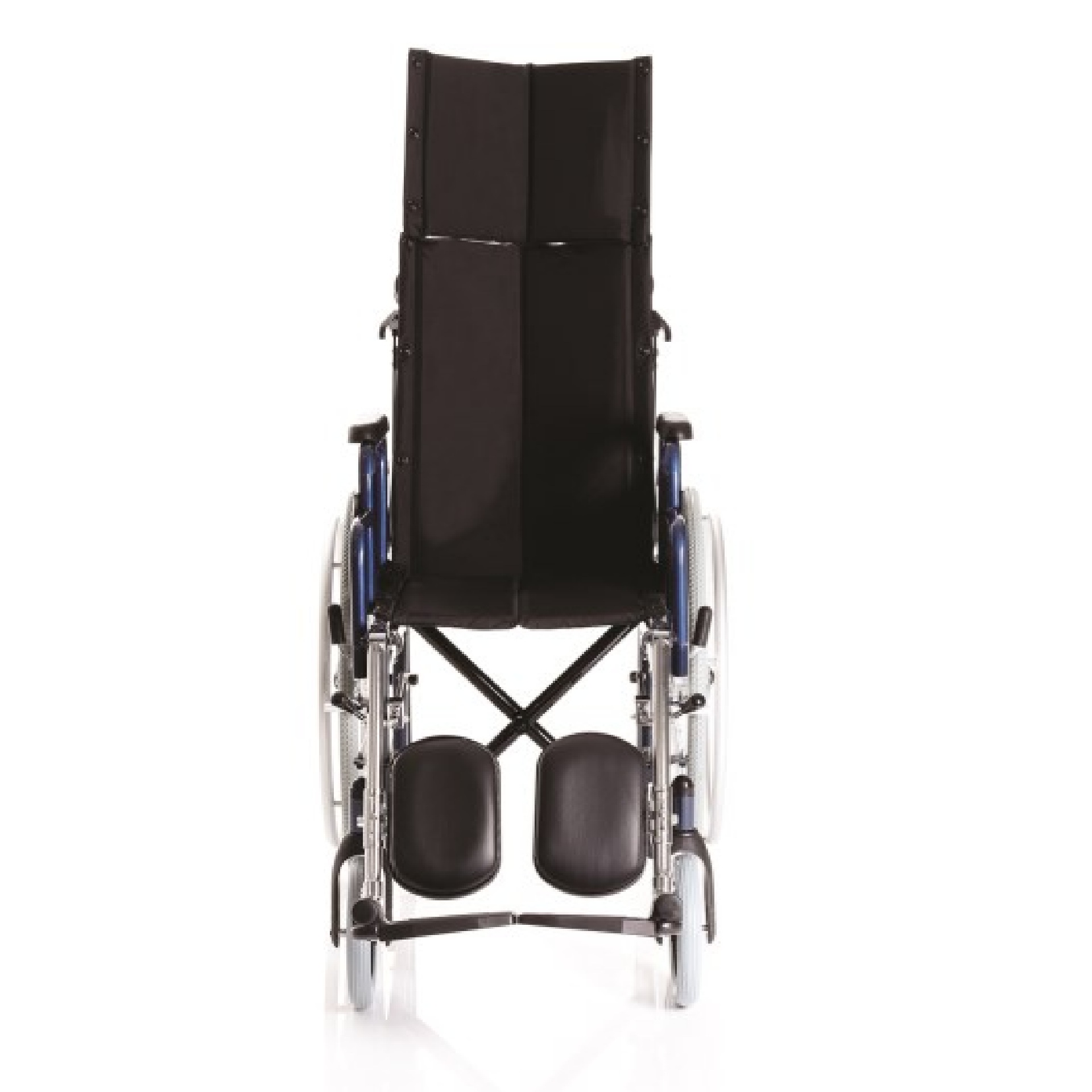 Costruita in acciaio verniciato, singola crociera, seduta e schienale in nylon nero imbottito lavabile. Schienale prolungato regolabile in inclinazione per mezzo di pistoni. Prolunga schienale estraibile. Braccioli in PU estraibili. Ruote posteriori in PU senza camera d’aria (Ø 60 cm) a razzi. Ruote anteriori (Ø 20cm) in PU. Ruotini antiribaltamento di serie. Pedane elevabili, girevoli, estraibili ad inclinazione e lunghezza regolabili con poggiagambe regolabili in altezza. Freno meccanico posto sulle ruote posteriori e non freno operatore.