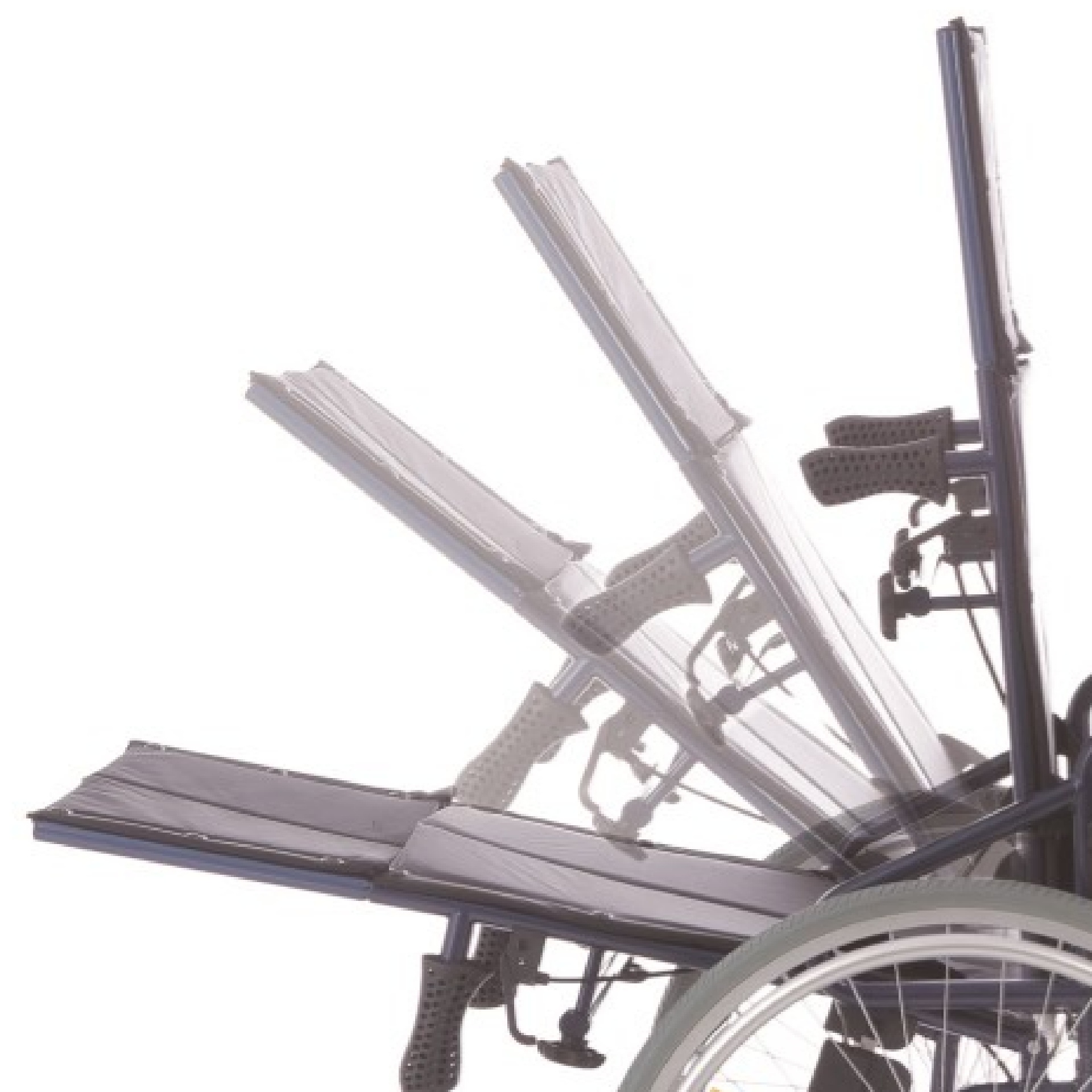 Pedane elevabili, estraibili e regolabili in lunghezza con poggiagambe regolabili in altezza. Freno meccanico posto sulle ruote posteriori e non freno operatore.