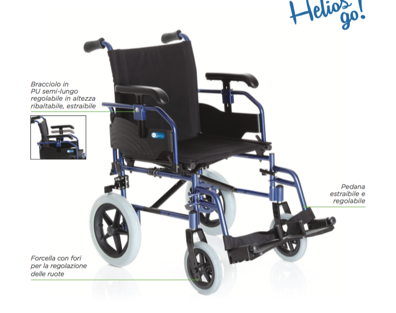 Ruote anteriori in PU Ø 20 cm con forcella in alluminio con fori per la regolazione delle ruote.