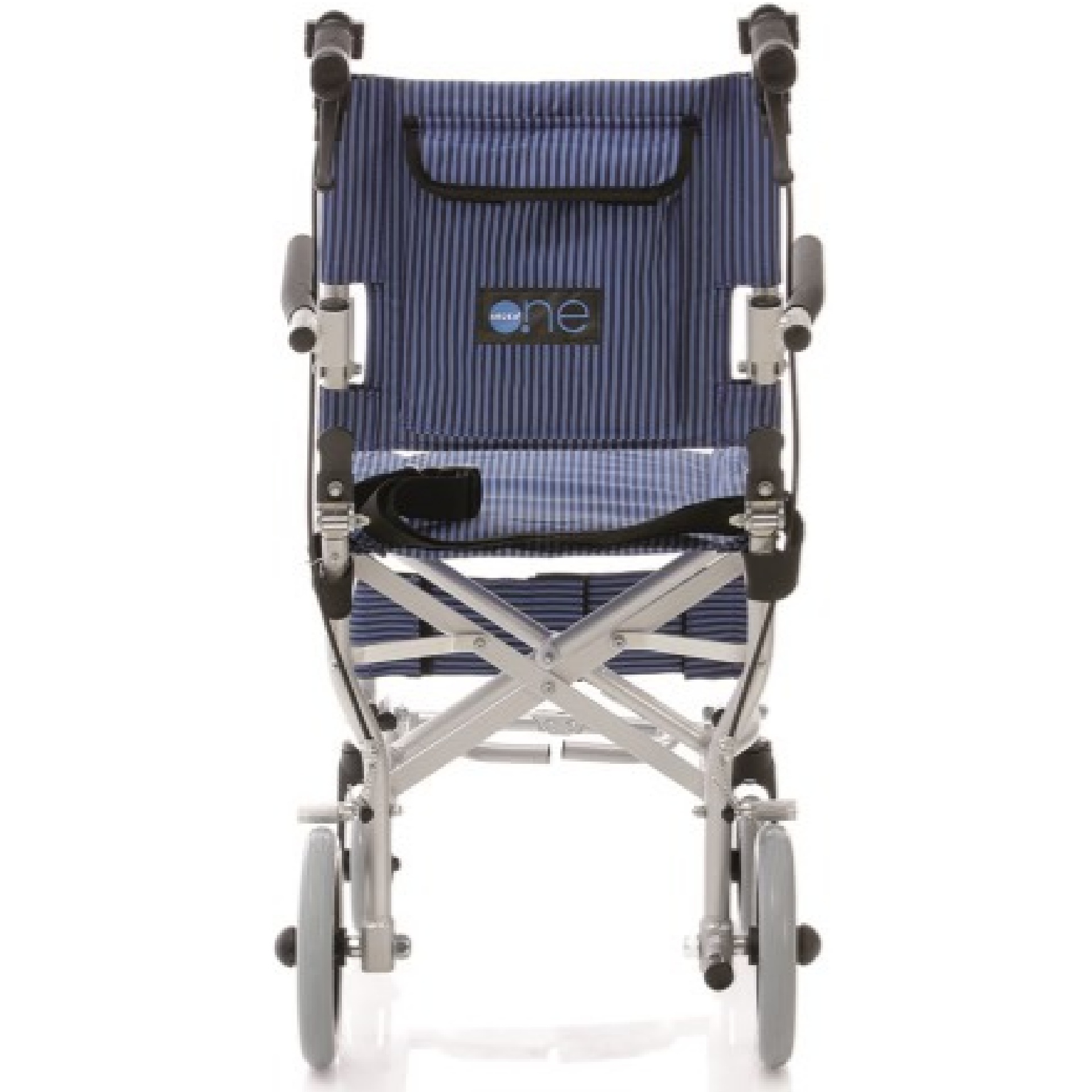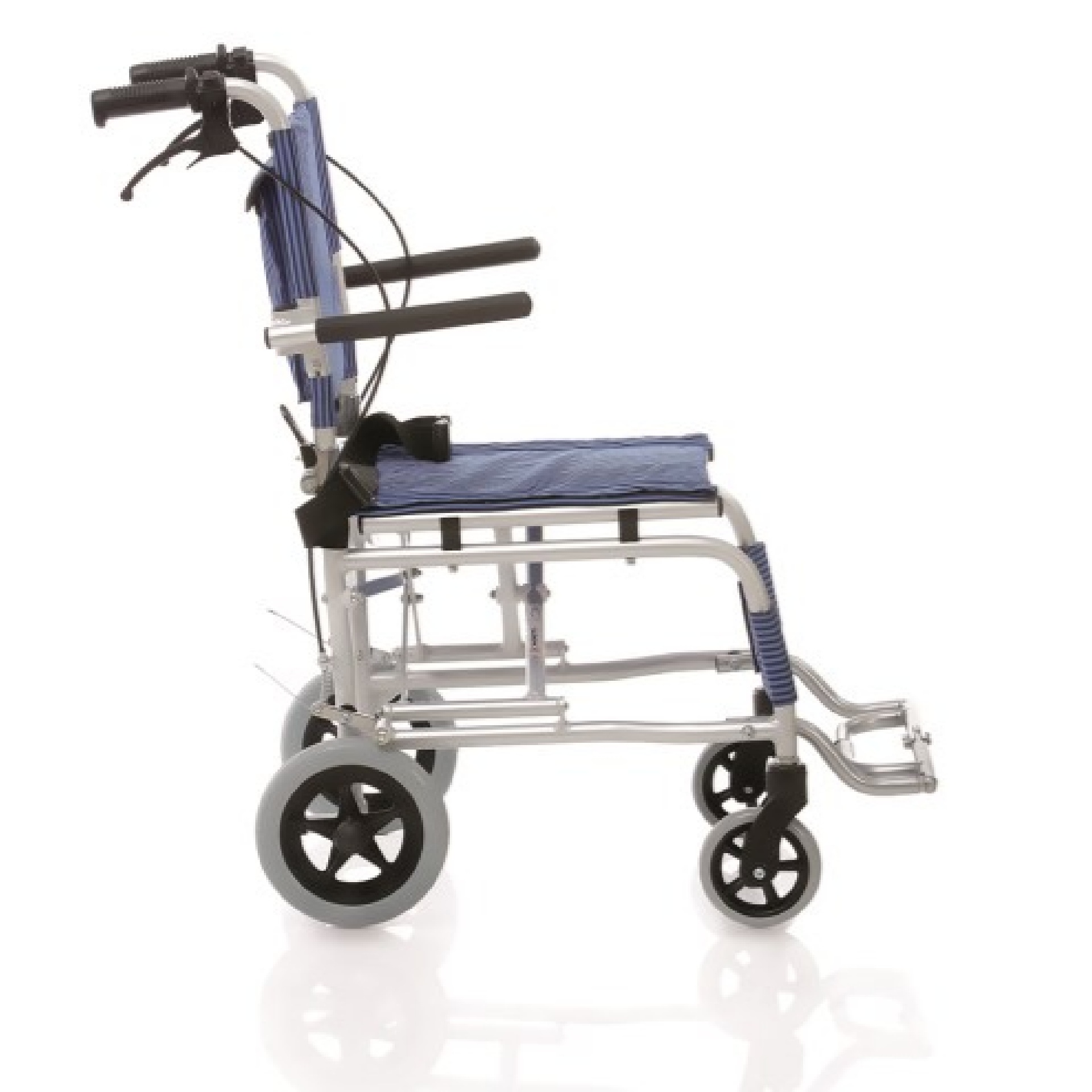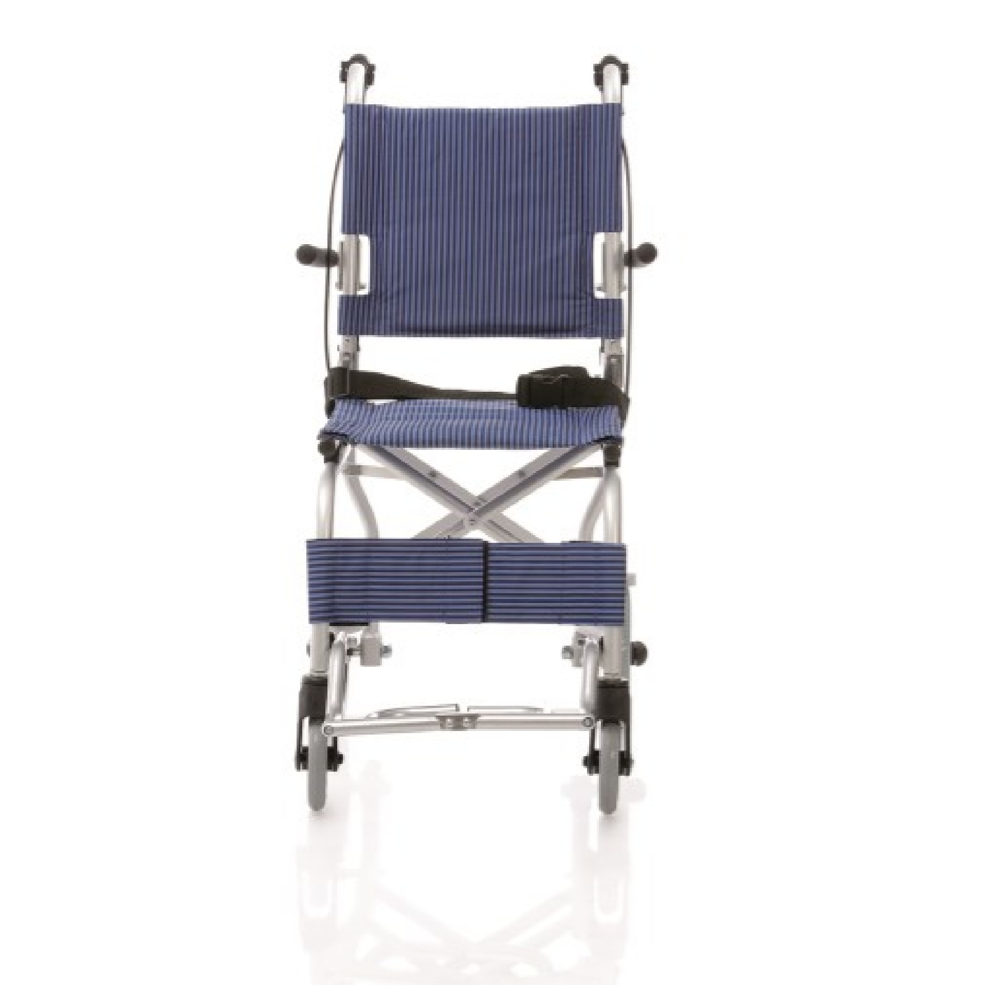 Ruote frontali e posteriori piene. Braccioli ribaltabili. Completa di cintura. Cinturino poggiapolpacci.