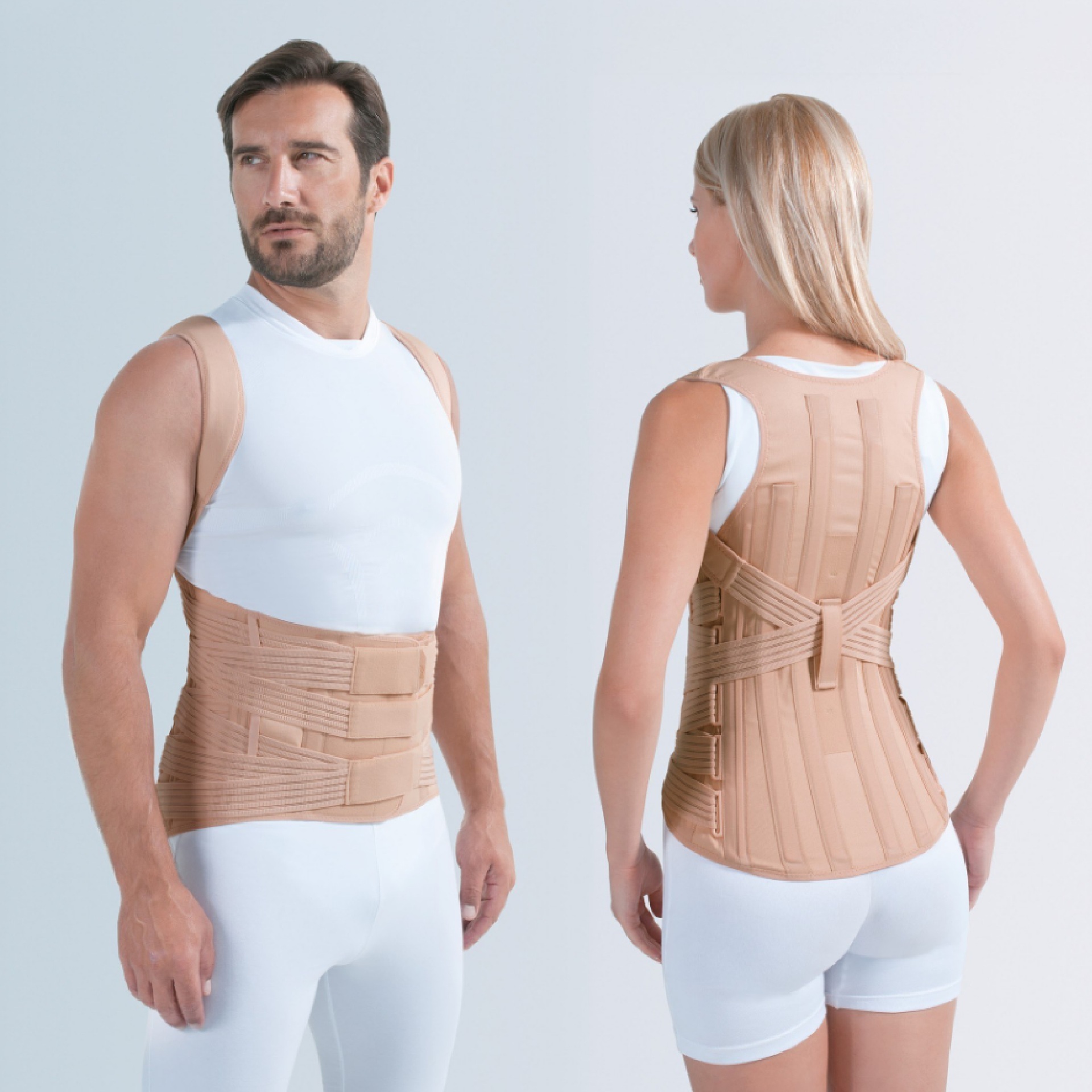 Corsetto dorsolombare in cotone elastico altamente traspirante, conformato anatomicamente.