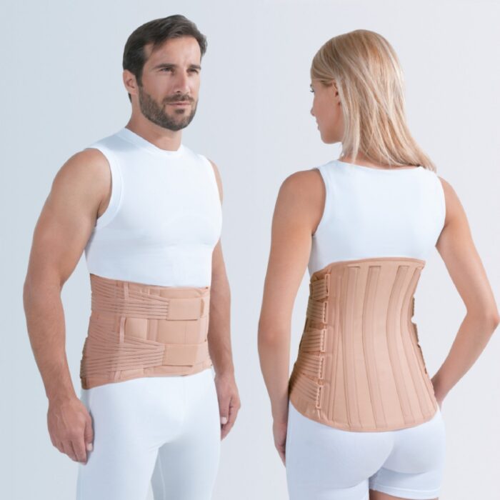 Corsetto dorsolombare in cotone elastico altamente traspirante, conformato anatomicamente.