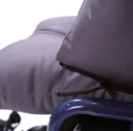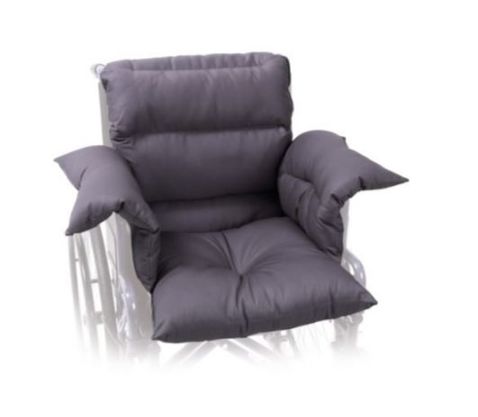 Set di 3 cuscini per carrozzina in fibra cava siliconata, completi di fodero in cotone. Elementi collegate da cerniere disinnestabili.
