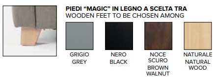 Cuscini per seduta realizzati in poliuretano espanso a densità 30 kg/m³, cuscini per schienale in poliuretano espanso a densità 18 kg/m³.