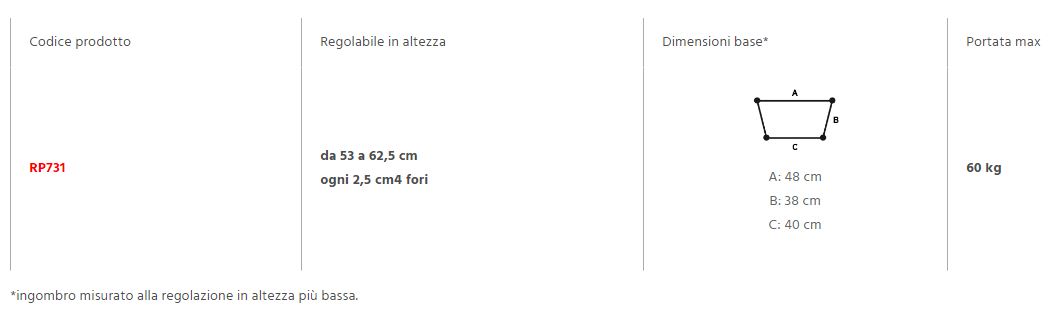 Regolabile in altezza ogni 2,5 cm H: 53 ÷ 62,5 cm. Portata max 60 kg.