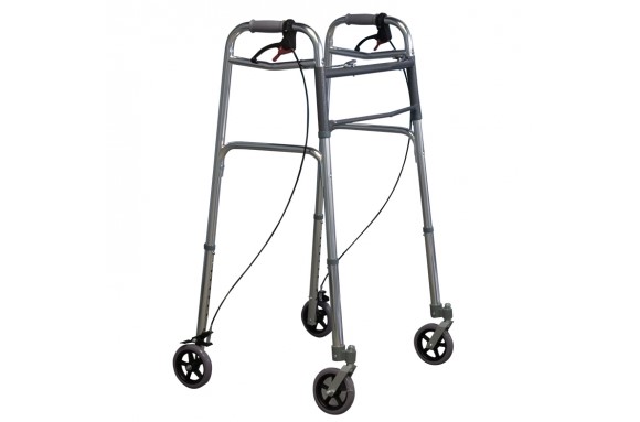 Deambulatore pieghevole con struttura in alluminio, con due barre stabilizzatrici orizzontali in acciaio. Dotato di 2 ruote da 4” anteriori, piroettanti e con dispositivo di blocco direzionale e due puntali con autobloccante a pressione, posteriori.