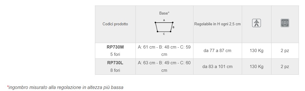 - Small Regolabile da 65 a 75 cm – 5 fori, portata massima 130 kg;