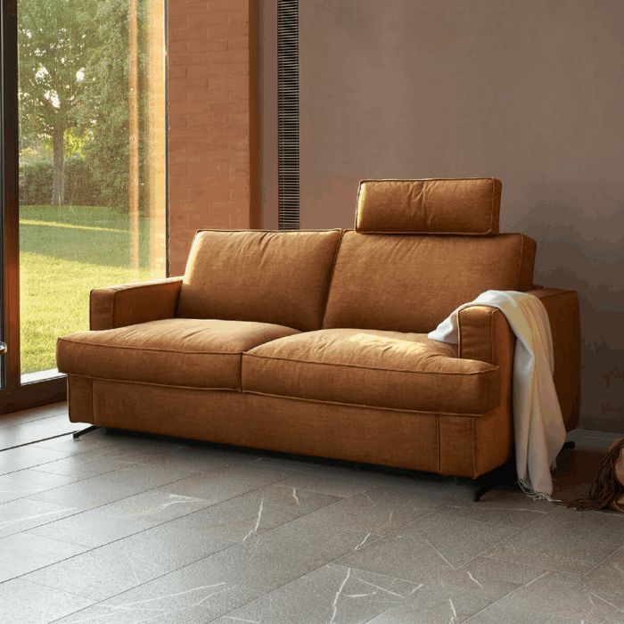 Apertura del divano in una sola rotazione che permette di conservare i cuscini di seduta e di schienale agganciati alla rete.