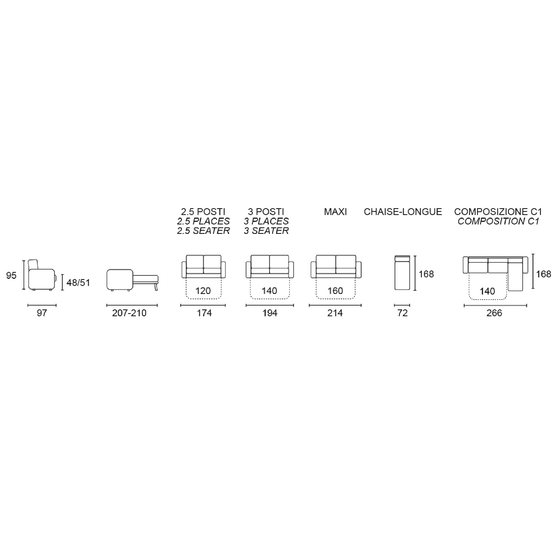 - Maxi : Larghezza 214 cm, Profondità 97 cm, Altezza 95 cm. Dimensioni materasso 160×190.