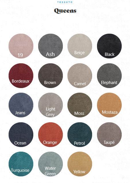 Cuscini per seduta realizzati in poliuretano espanso a densità 27 kg/m³, cuscini per schienale in poliuretano espanso a densità 18 kg/m³.