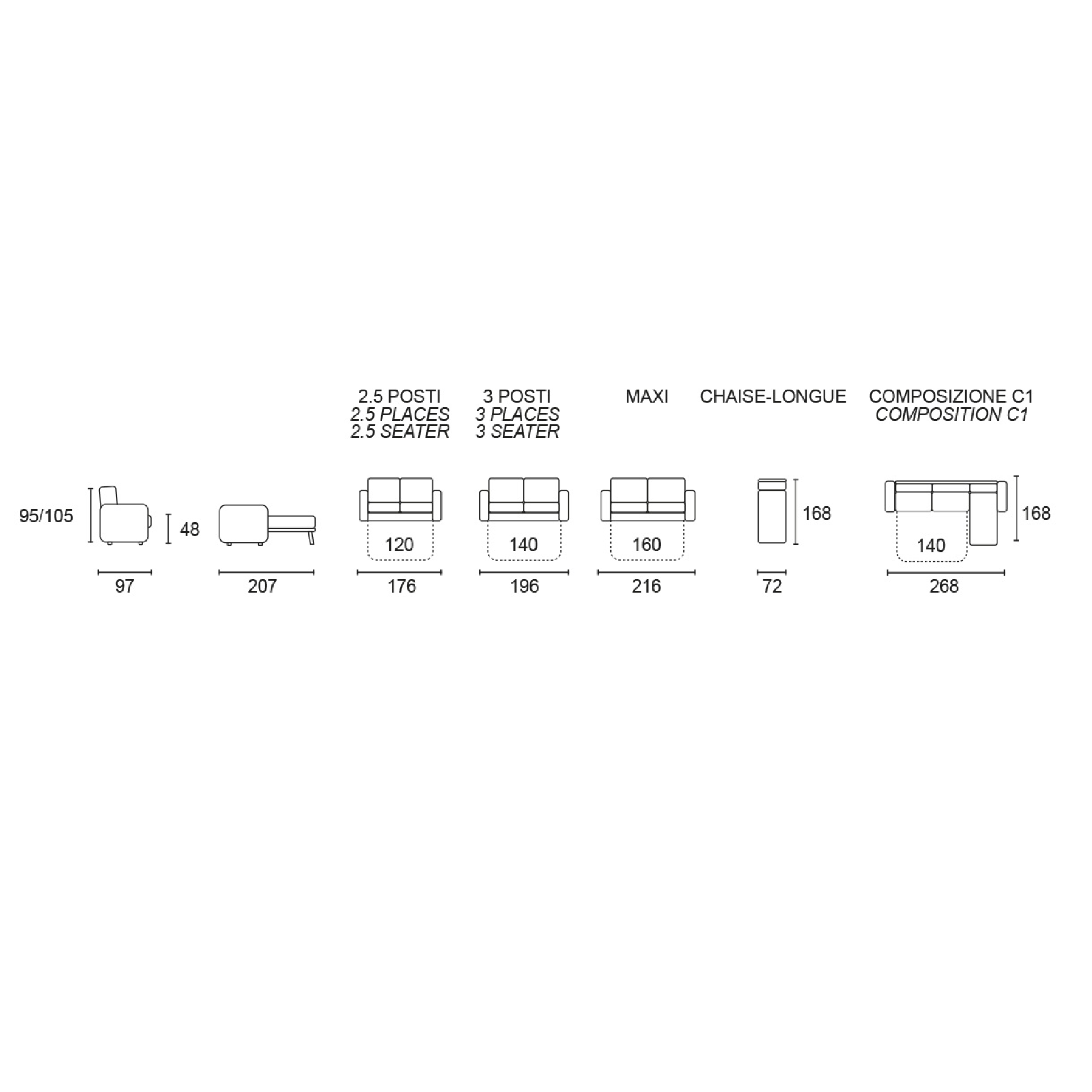 - composizione C1: Larghezza 253 cm, Profondità 168 cm, Altezza 95 cm. Dimensioni materasso 140×190.