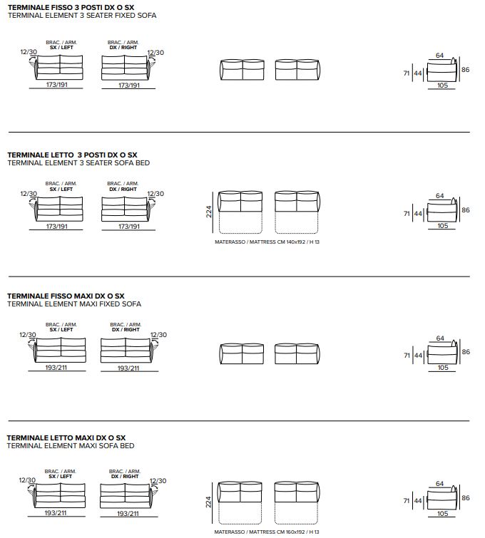 Disponibile versione Divano Letto 3 posti/Maxi o terminale senza bracciolo (DX o SX) per penisola.