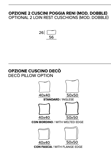 Cuscini di seduta in poliuretano espanso di densità 30 Kg m³ ricoperti da fibra poliestere “ovatta 300 gr” Cuscini di schienale in poliuretano espanso di densità 18 Kg/m3 SS ricoperti da fibra poliestere “ovatta 300 gr” Per le parti in legno vengono utilizzati pannelli di legno fabbricati a norma ecologica e parti in legno multistrato I braccioli si possono piegare adattandoli in base al comfort desiderato.