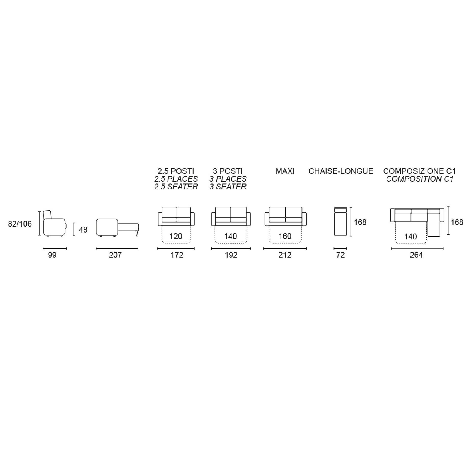 - 2.5 Posti : Larghezza 172 cm, Profondità 99cm, Altezza 82/103cm. Dimensioni materasso120x190.