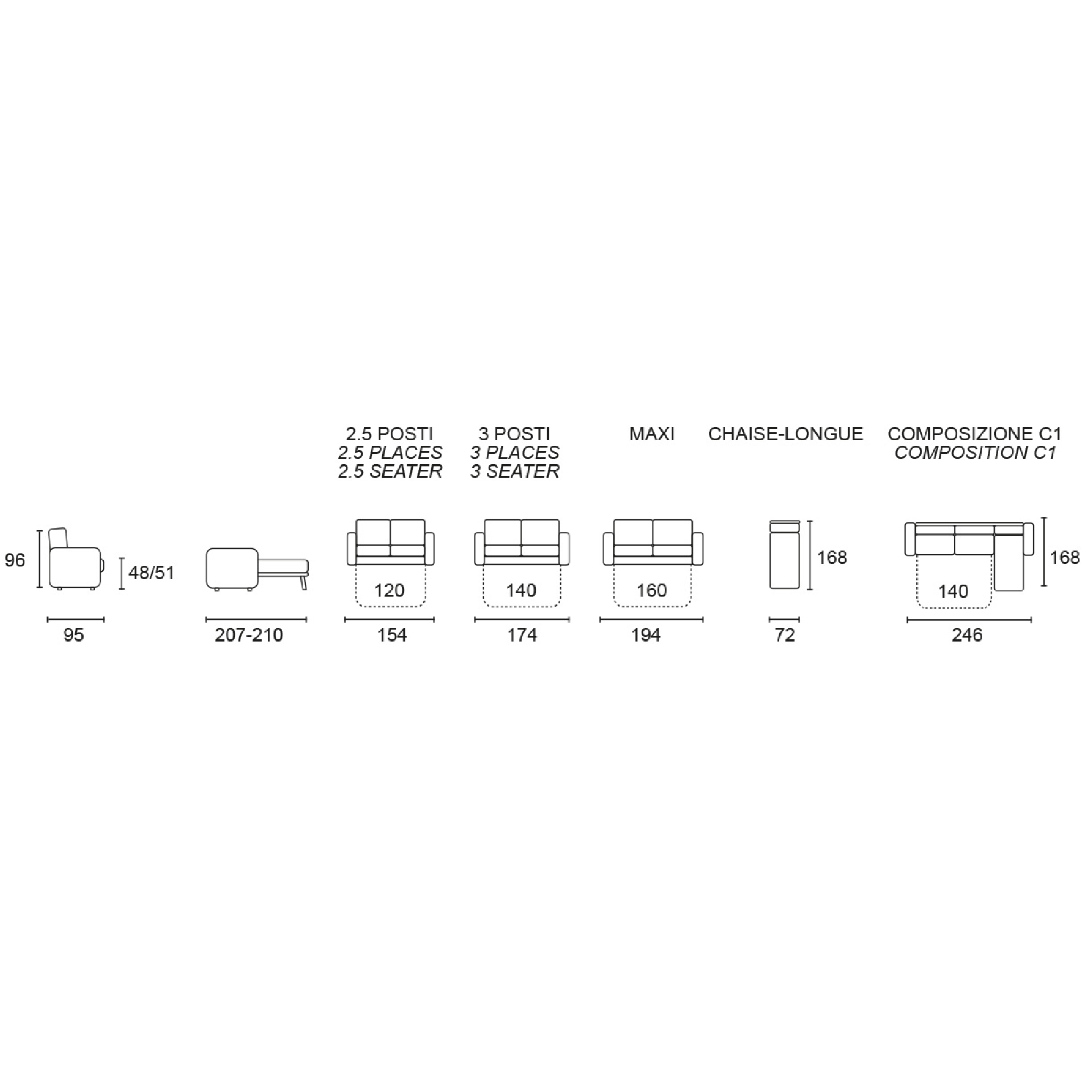 - Maxi : Larghezza 194 cm, Profondità 95cm, Altezza 96cm. Dimensioni materasso160x190.