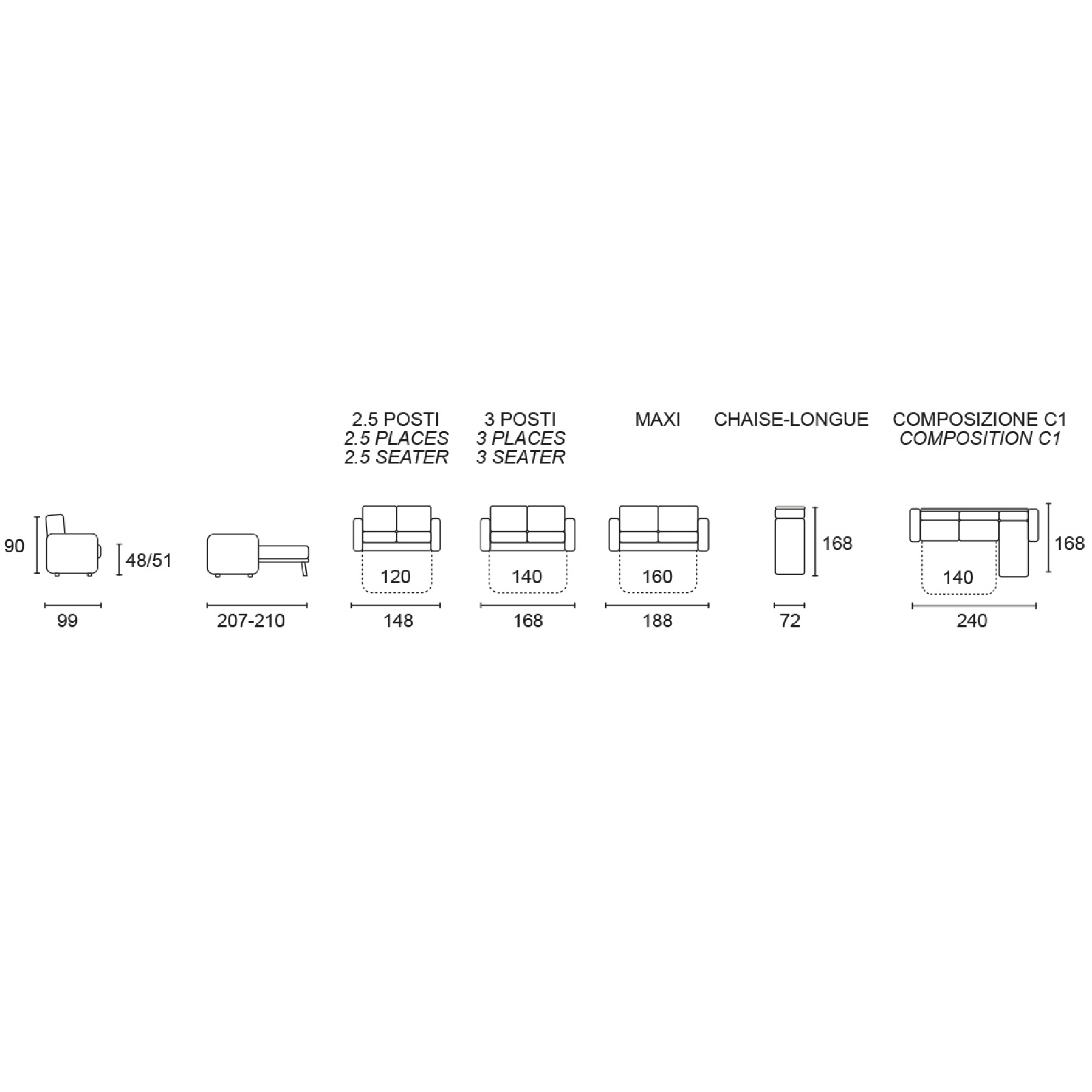 - Composizione C1:Larghezza 240 cm, Profondità 168 cm, Altezza 90 cm. Dimensioni materasso 140×190 cm.