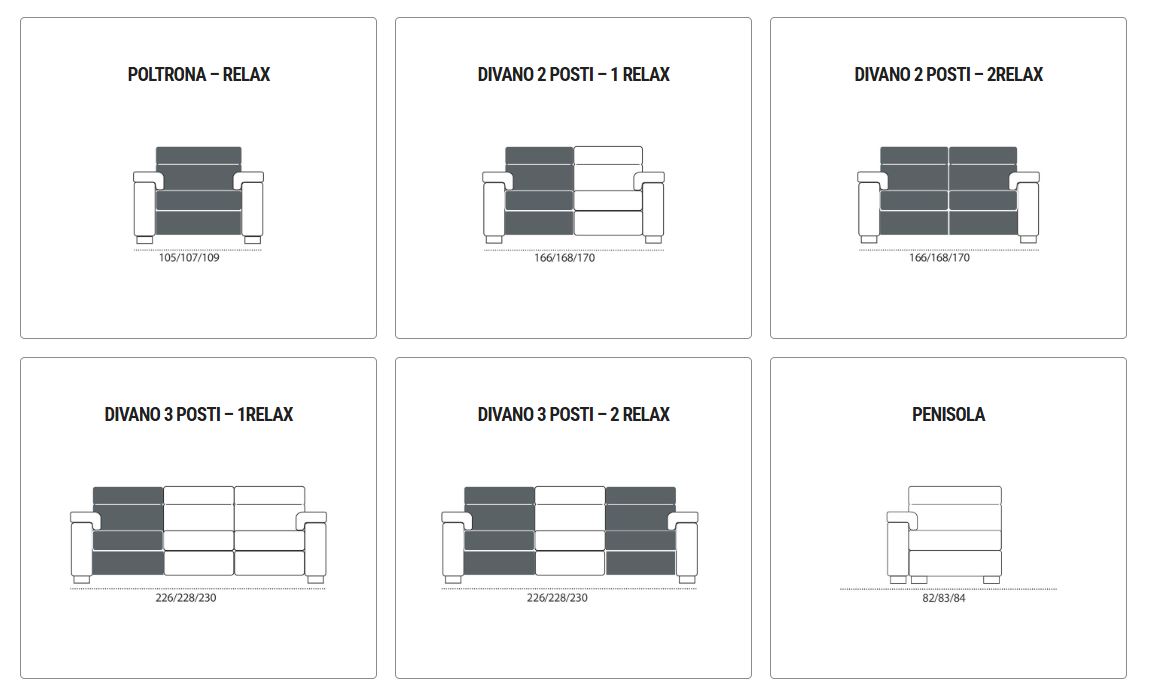 Divano relax BRANDO disponibile sia nella versione Poltrona Relax, sia nella versione Divano a 2/3 posti. Per ciascuna versione è possibile scegliere tra la variante fissa e quella con movimento a motore.