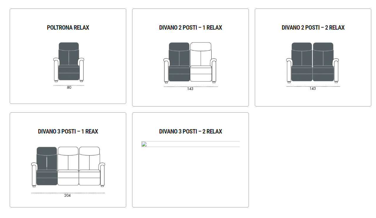 Divano relax, disponibile nella verisoni a 2 o 3 posti, fissi o con movimento ad 1 motore, comandato tramite una pulsantiera al lato del bracciolo. La versione a 3 posti è disponibile al massimo nella versione con 2 posti con movimento a motore ed 1 fisso.