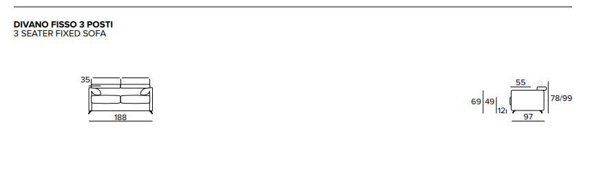 - Divano 3 posti: Larghezza 188 cm, Altezza 78/99 cm, Profondità 97 cm. Altezza Seduta 49 cm.