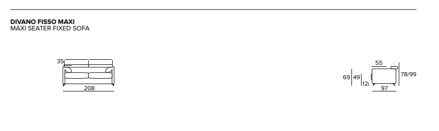 - Divano maxi: Larghezza 208 cm, Altezza 78/99 cm, Profondità 97 cm. Altezza Seduta 49 cm.