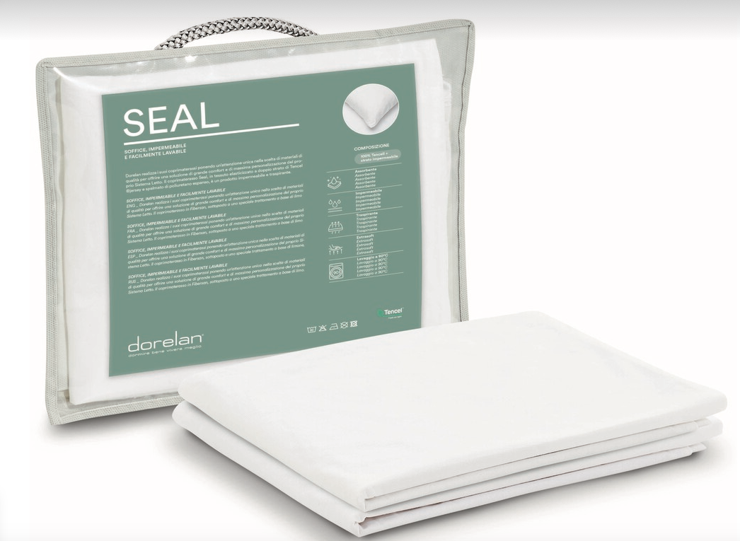 Il copriguanciale Dorelan Seal è realizzato con un doppio strato di Tencel reso impermeabile per mezzo di uno specifico procedimento.