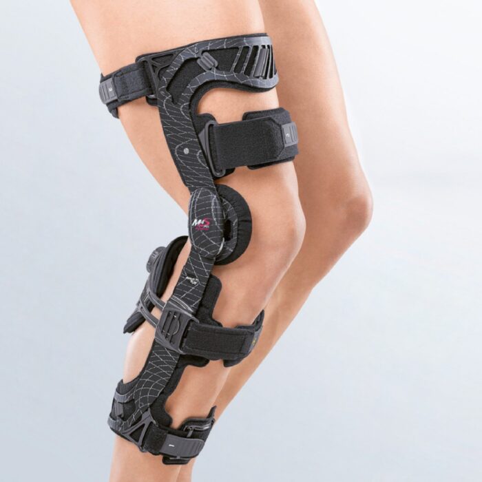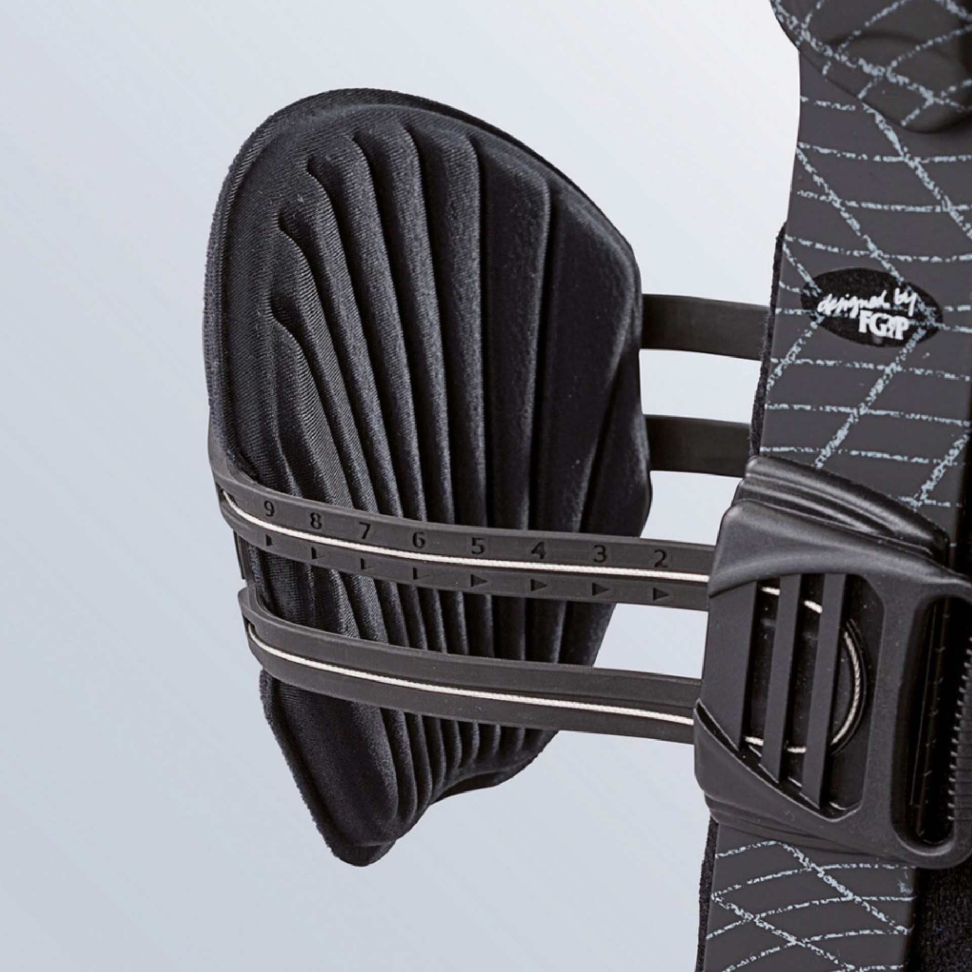 • mediante 4 fasce a strappo numerate regolabili e sistema di tensionamente epicicloidale per il cuscinetto tibiale