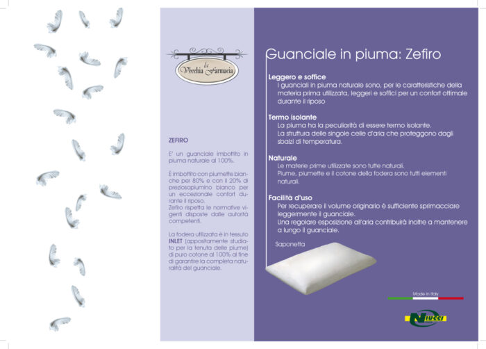Guanciale imbottito in piuma naturale al 100%, è imbottito per l’80% da piumette bianche e per il restante 20% di prezioso piumino bianco per un eccezionale comfort durante il sonno.