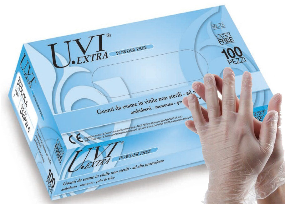 Guanti monouso in vinile, cloruro di polivinile, non sterili. Superficie totalmente liscia, privo di talcatura è ideale per pelli sensibili. Privi di lattice.