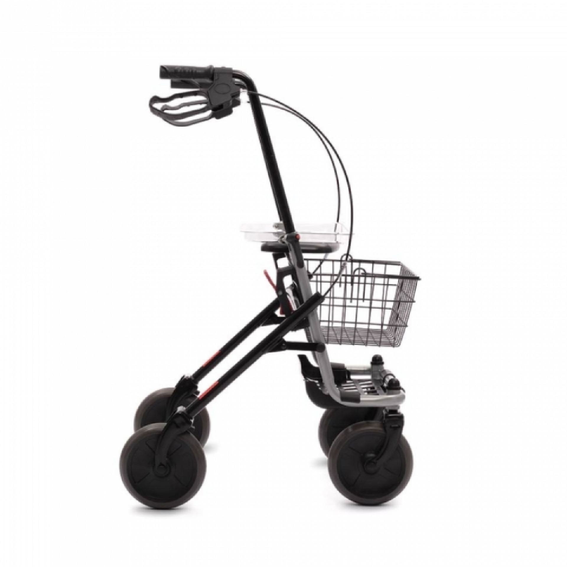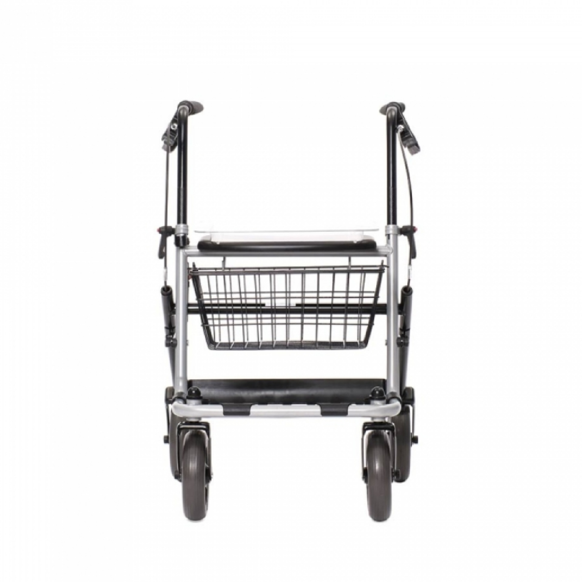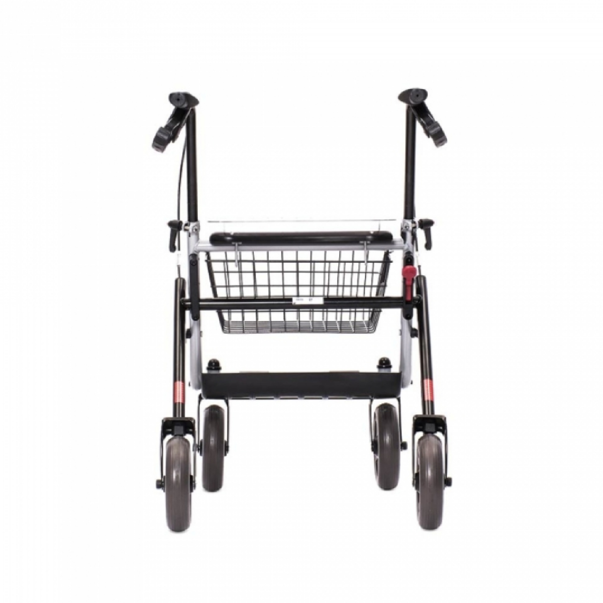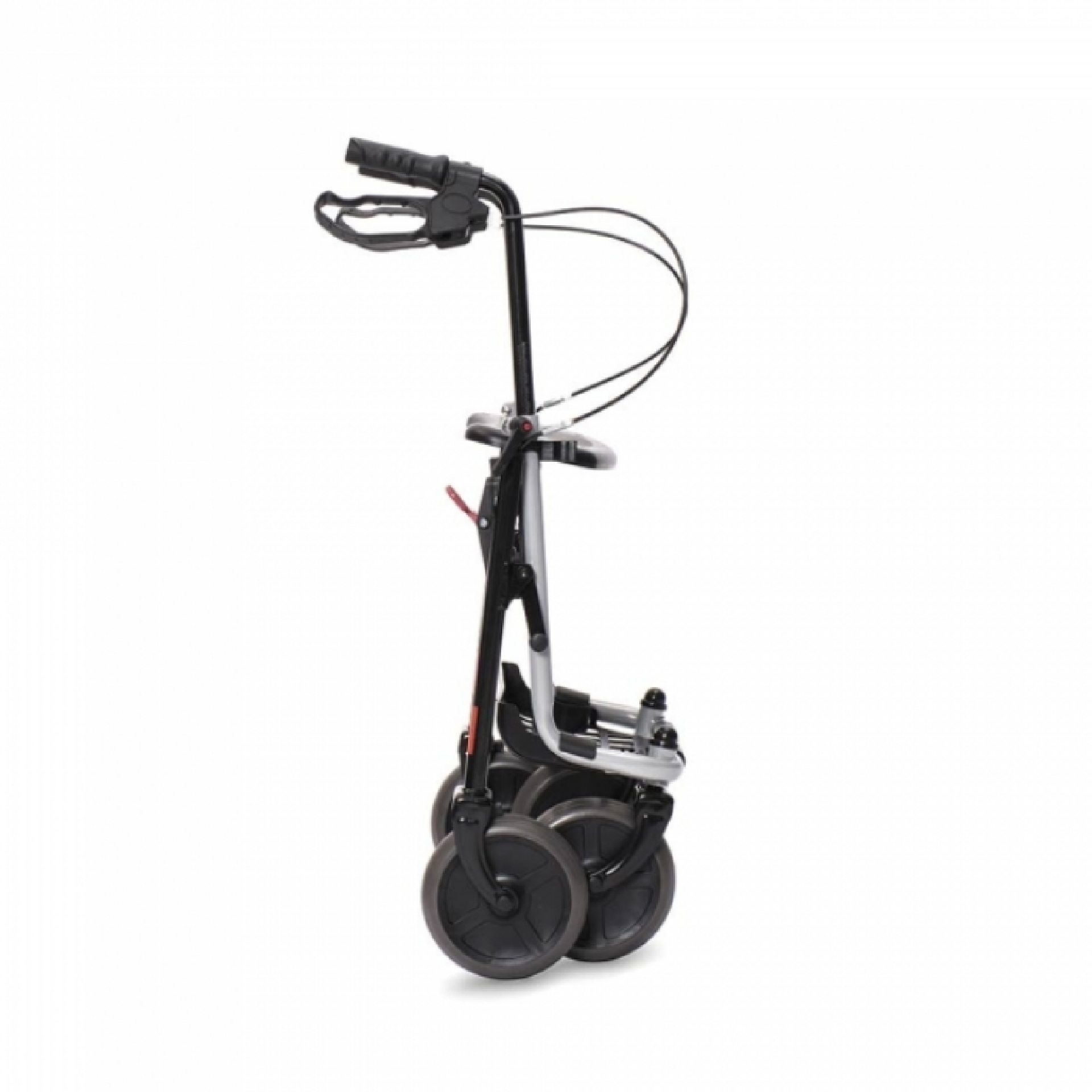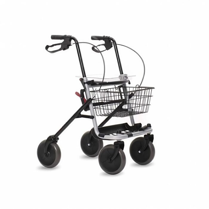 Deambulatore rollatore con ruote anteriori piroettanti e ruote posteriori fisse con sistema frenante.