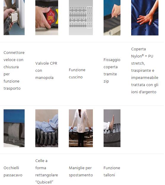 Le celle del materasso sono realizzate con lan tecnica del “cell-incell” (la parte inferiore serve da supporto anche in caso di mancanza di corrente) e una particolare forma rettangolare “Qubicell” che consente maggior comfort dovuto ad una miglior dispersione dei punti di contatto Il materasso viene fornito con coperta stretch in poliestere/PU traspirante, impermeabile, trattata agli ioni d’argento, fissata per mezzo di zip, può essere fissato al letto tramite cinghie in dotazione ed è dotato di occhielli passacavo. La valvola CPR (Cardio Pulmonary Resuscitation) permette uno sgonfiaggio rapido per interventi di rianimazione urgenti. Il compressore digitale permette di impostare peso del paziente e tempo del ciclo; molto silenzioso, compatto e leggero.